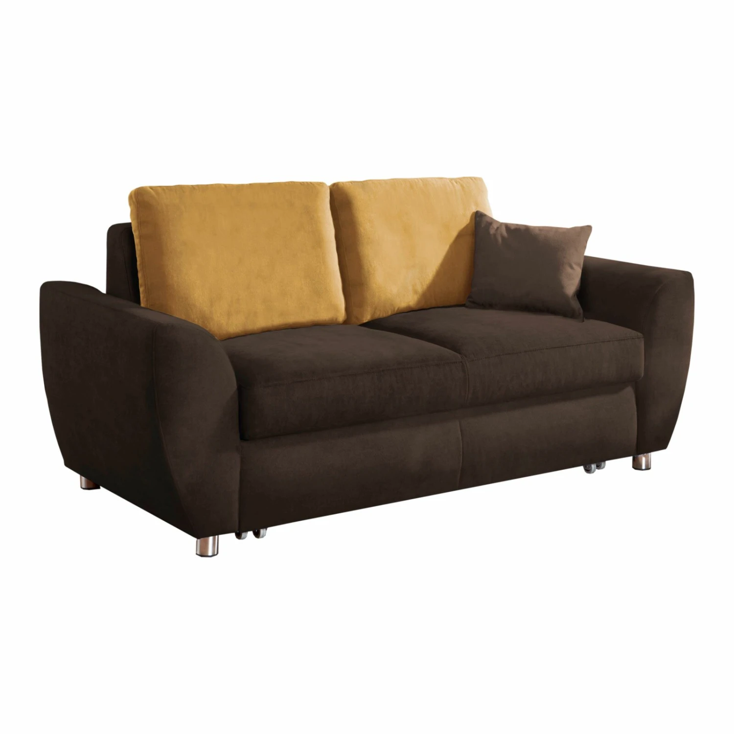 Dieses 2-Sitzer Schlafsofa in der Farbe Espresso ist nicht nur komfortabel, sondern auch ein echter Blickfang. Zwei Rückenkissen in der Farbe Mustard sind bereits im Lieferumfang enthalten und runden das moderne Design zusätzlich ab. Außerdem ist das Sofa mit einer etwa 140 x 205 Zentimeter großen Liegefläche ausgestattet, auf der gelegentliche Übernachgungsgäste ihren Platz finden. Da der Rücken mit dem Originalstoff bezogen ist, können Sie dieses Sofa auch frei in den Raum stellen.