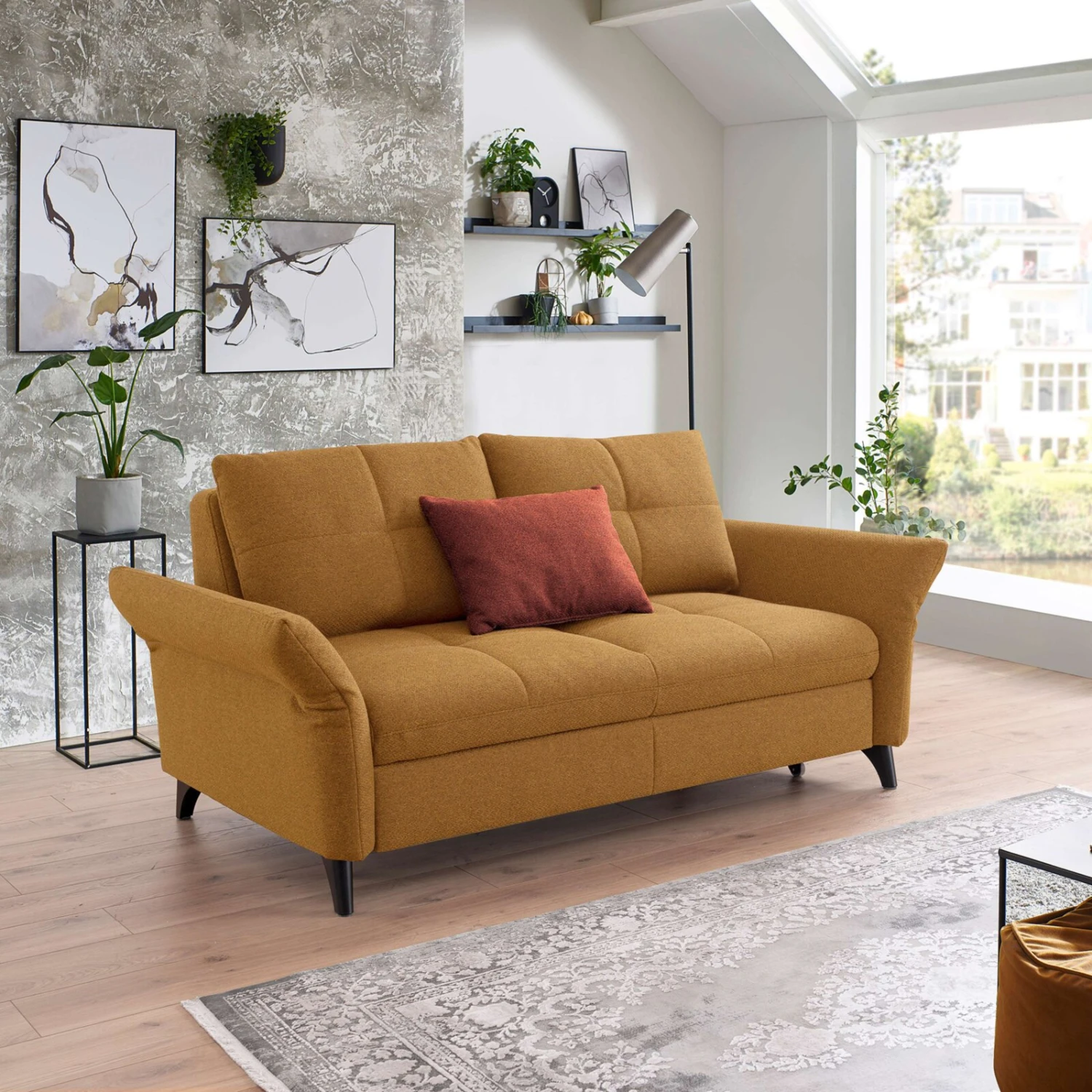 2-Sitzer Sofa – gelb – Flachgewebe – mit Kissen