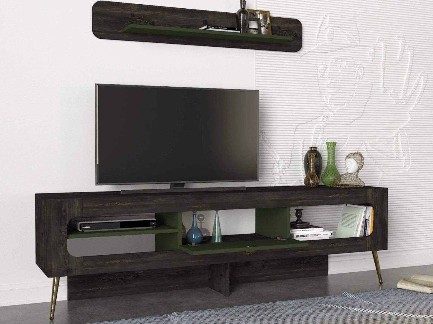 In dunklen Farben ist die Holz-Wohnwand ein Design-Highlight für das Wohnzimmer. Sie besteht aus einem modernen TV-Lowboard, das mit einem Hängeregal in Boardform beliiebig kombiniert werden kann. Auf dem Lowboard können Sie Ihren Fernseher gut in Szene setzen, die offenen Fächer bieten sich an, um zum Beispiel Geräte abzustellen, wie einen TV-Receiver oder einen Blu-Ray-Player. Im mit einer Klappe verschlossenen Fach können Sie Alltagsgegenstände unterbringen, die Sie gerne in Fernsehnähe haben, wie ein Tablet. Ob Sie auf dem Hängeregal Keramik ausstellen, (Kunst-)Blumen, Fotos oder eine individuelle Sammlung, lassen Sie Ihrer Kreativität freien Lauf.