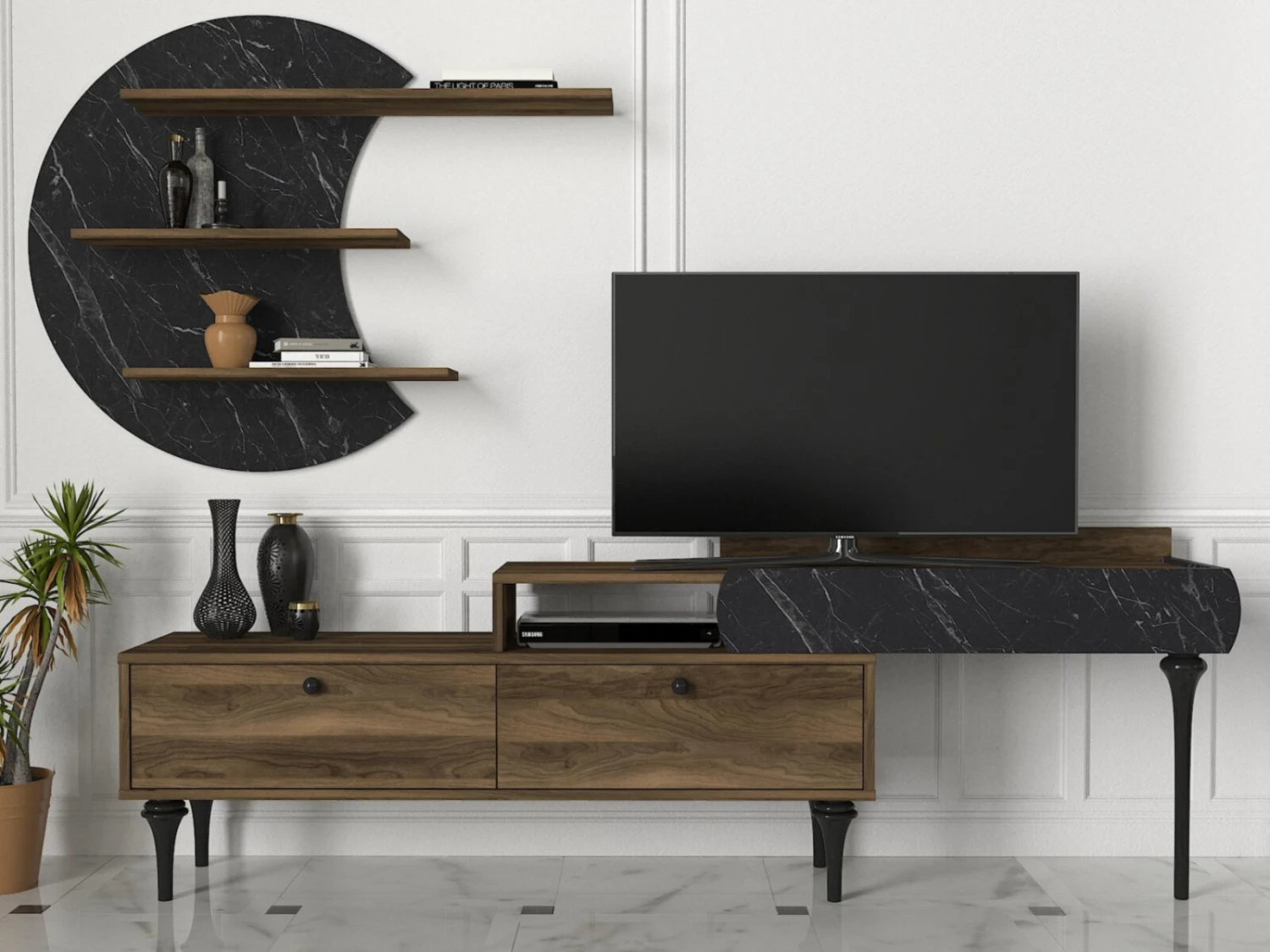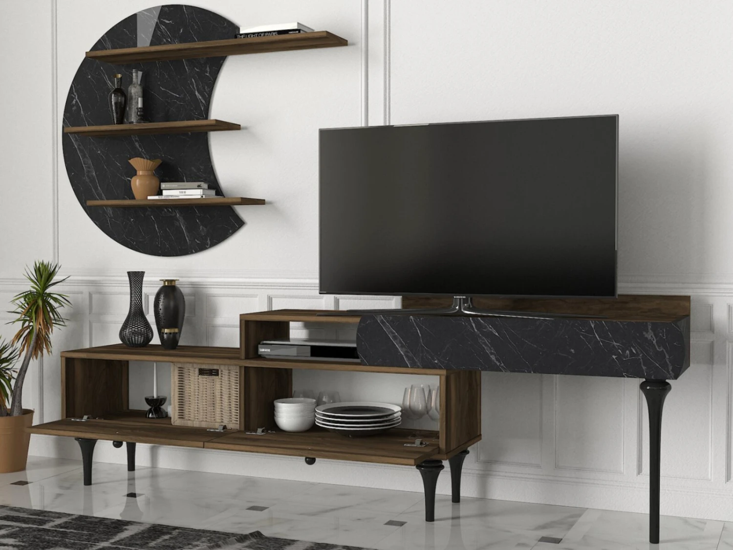 Die moderne Wohnwand zieht die Blicke auf sich. Die Mischung aus dunkler Marmoroptik und Holznachbildung bildet eine edle Kombination, die auch mit Praktikabilität überzeugt. Auf dem abgestuften Lowboard findet nicht nur der Fernseher Platz, im offenen Fach unter dem TV können Sie einen Receiver anschließen, die zwei mit Klapptüren geschlossenen Fächern können Sie nutzen, um private Unterlagen abzulegen. Im Hängeregal mit seinen drei offenen Regalreihen können Sie schöne Dinge zeigen, seien es (Kunst-)Pflanzen, Keramik, Fotos, Bücher oder Kunst.