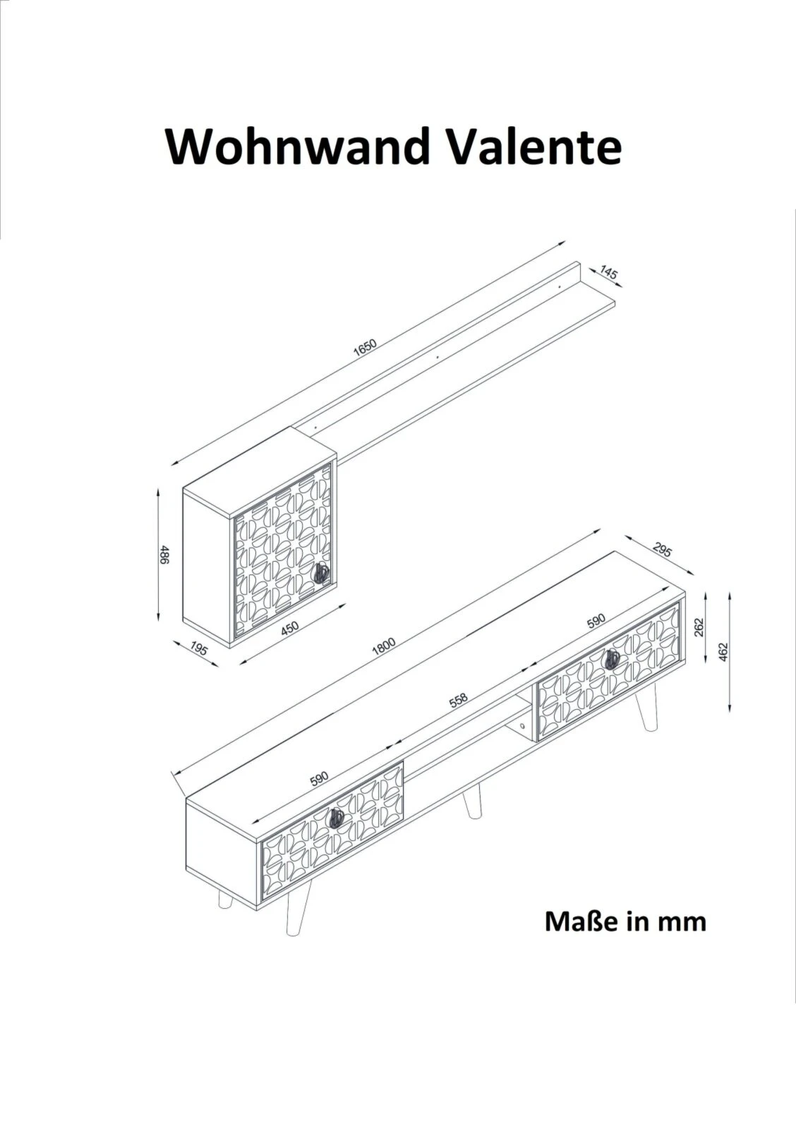 - Lowboard: BxHxT ca. 180 x 46,3 x 29,5 cm