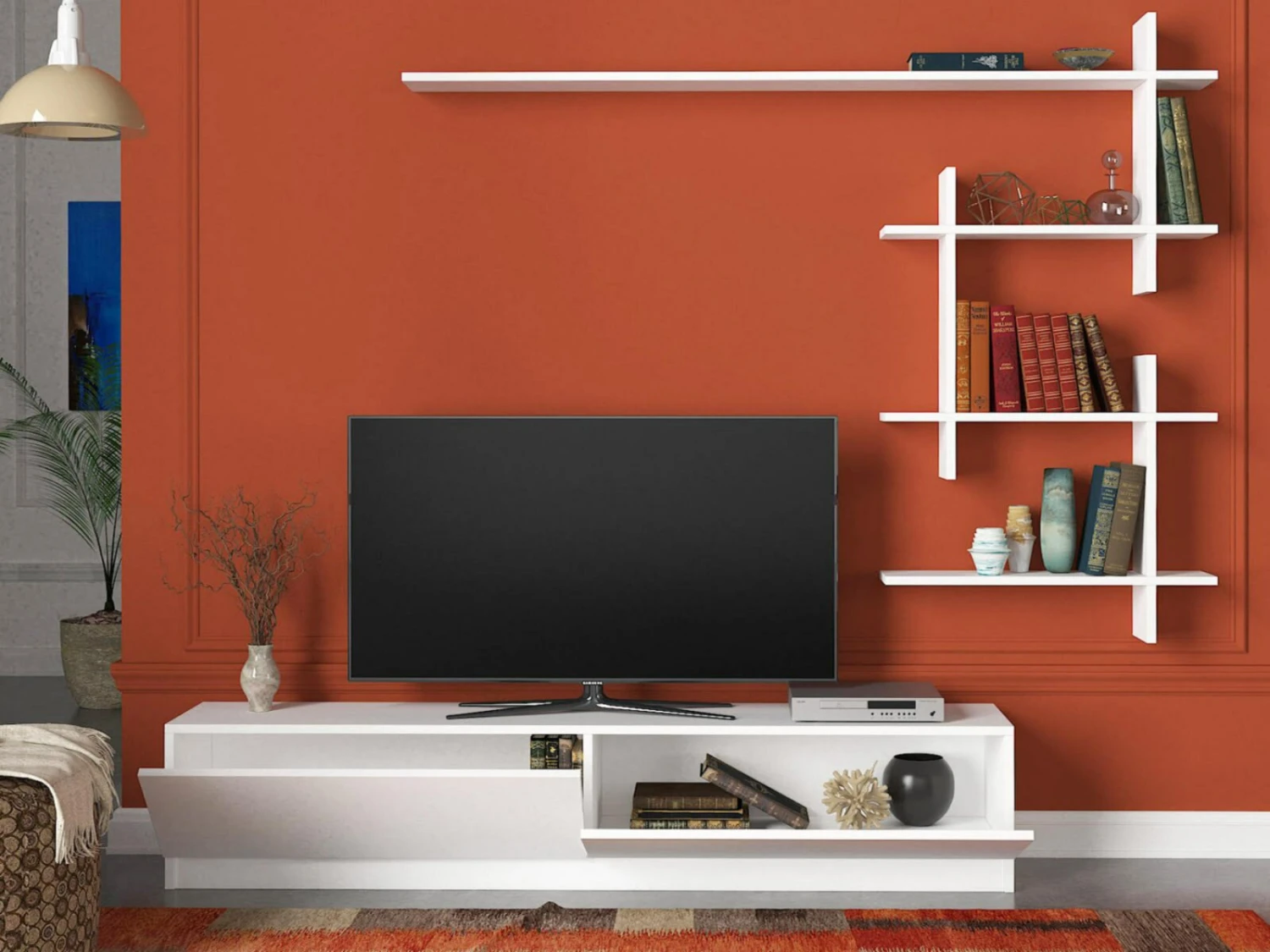 Die stilvolle weiße Wohnwand gibt Ihrem Fernseher einen schönen, modernen Rahmen. Dazu bietet sie Stauraum, denn in den mit Klappen geschlossenen Fächern (BxH ca. 79,8 x 25,9 cm) können Sie im Wohnzimmer benötigte Gegenstände zentral verstauen. Dazu kommt noch ein modernes, offenes Hängeregal, das sich als Präsentationsort anbietet: Ob für gerahmte Fotos, zum Ausstellen einer Sammlung, für die liebevolle Dekoration oder für etwas anderes, lassen Sie Ihrer Kreativität freien Raum.