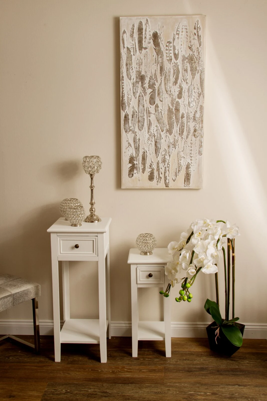 Beistelltisch Set im Shabby Chic Design. Die weiße Oberfläche ist imleichten Used Look gehalten und macht dem Namen ELEGANCE alle Ehre. Die Schubkästen sind mit einem Griffen aus Metall versehen und bieten Platz für allerlei Kleinigkeiten. Nutzen Sie ihn im Flur als Schlüssel – oder Telefonablage oder im Wohnraum für eine Blumendekoration.