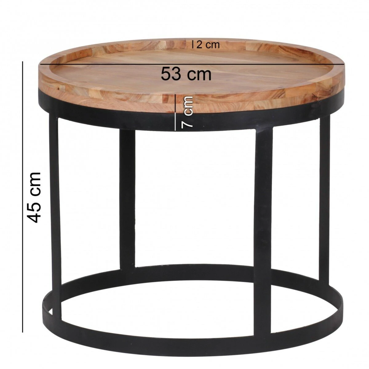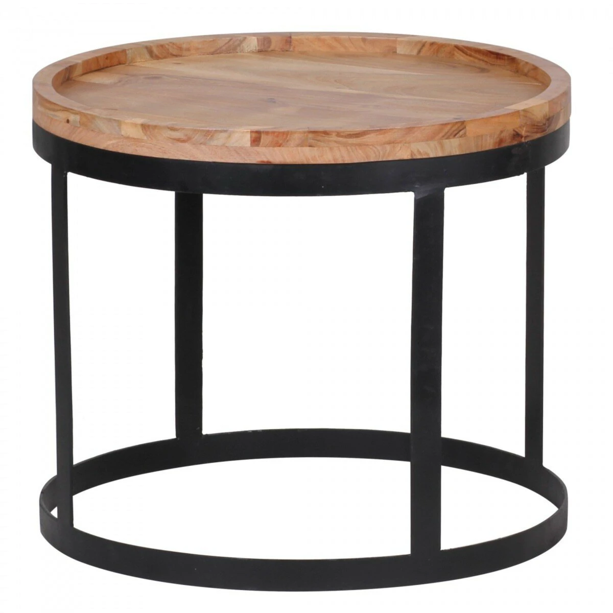 Ein schickes 2er-Set von Beistelltischen. Auf einem schwarzen Untergestelll aus Metall befindet sich jeweils eine Tischplatte aus massivem Akazienholz. Diese wurde zum Erhalt der natürlichen Maserung und zum Schutz der Oberfläche klar lackiert.