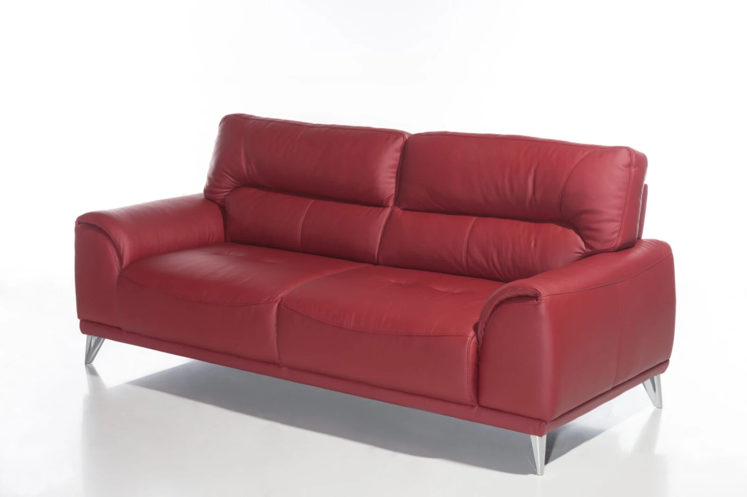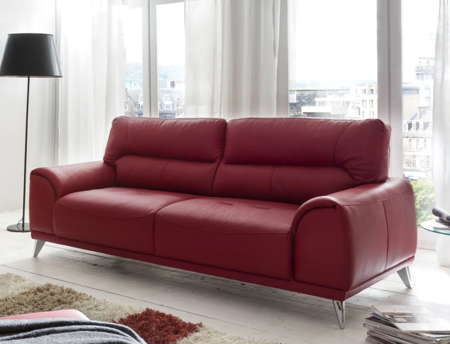 Modernes 3-Sitzer Sofa mit weichem Kunstlederbezug in der ausgefallenen Farbe Rot. Machen Sie es sich bequem auf einer Schaumstoff-Polsterung auf Wellenunterfederung und stellen Sie dieses Sofa frei in den Raum, da die Rückseite im Originalstoff bezogen ist. So sind Ihnen in der Zimmergestaltung keine Grenzen gesetzt. Der Bezug in Kombination mit den hohen glänzenden Metallfüßen peppt dabei jede Einrichtung auf.