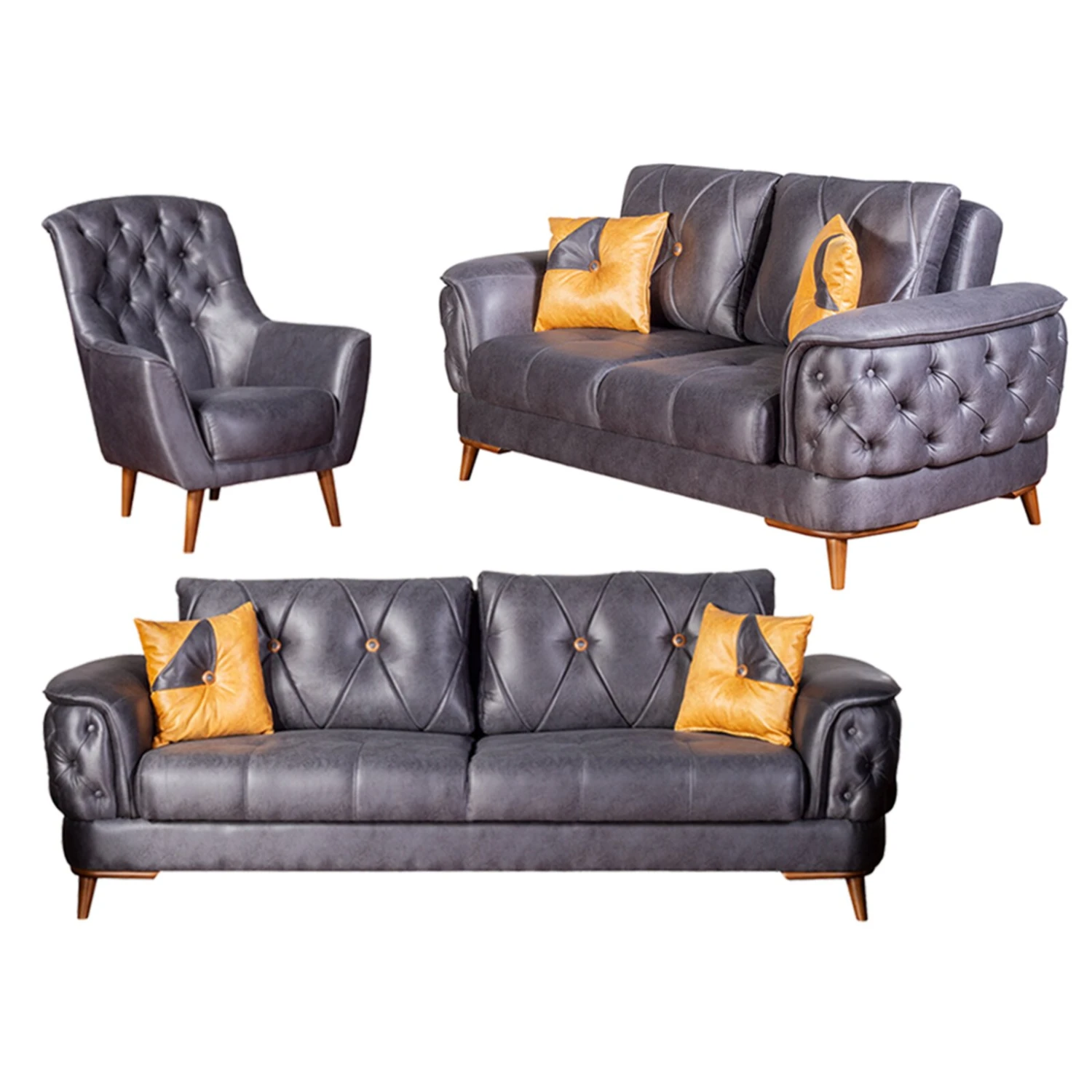 Der anthrazitfarbene Microfaserstoff verleiht dieser dreiteiligen Polstergarnitur ein stilvolles Aussehen, das sich in Ihrem Wohnraum widerspiegeln und für ein atemberaubendes Ambiente sorgen wird. Das 2-Sitzer- und das 3-Sitzer-Sofa sind mit praktischen Liegefunktionen ausgestattet, sodass hier beispielsweise gelegentliche Übernachtungsgäste untergebracht werden können. Die Rücken- und Zierkissen sind im Lieferumfang inklusive und runden die tolle Optik der Garnitur noch stimmig ab.