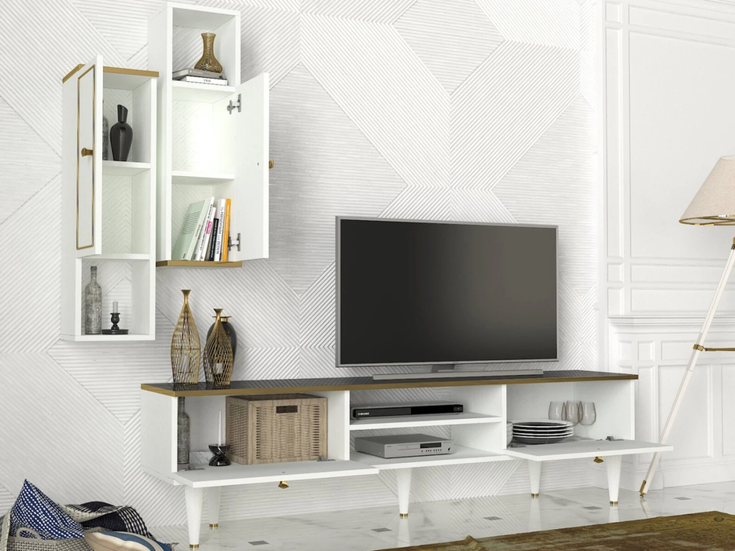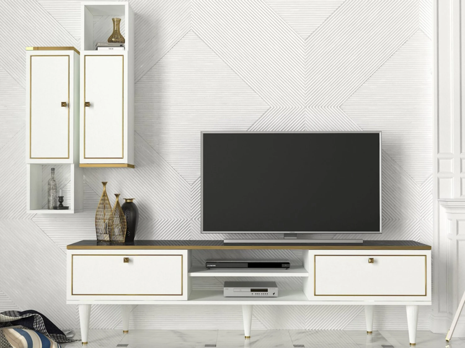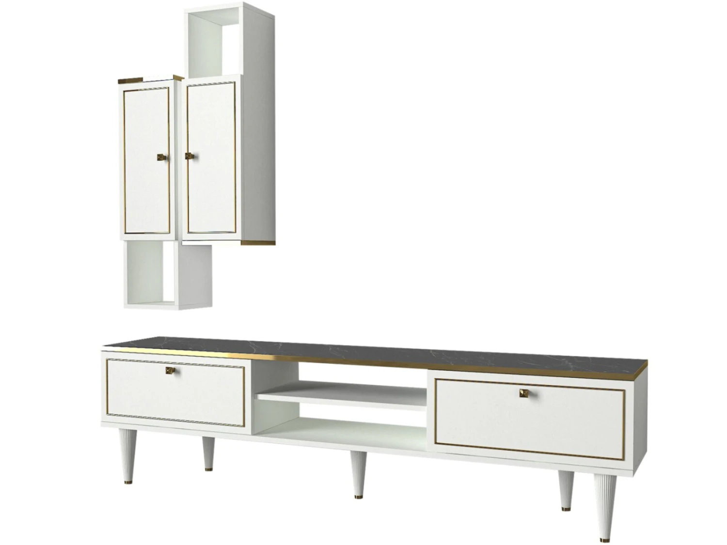 Die 3-teilige Wohnwand überzeugt durch ihr modernes Design und die vielen Stauraummöglichkeiten. Sie besteht aus einem TV-Lowboard und zwei Hängeschränken. So können Sie die Wohnkombination beliebig anordnen. Zum Highlight wird sie durch die goldfarbenen Absetzungen sowie den Oberboden in schwarzer Marmoroptik. Dieser bietet reichlich Platz für den Fernseher und Dekorationen. Ausgestattet ist das Lowboard mit offenen Ablagen für Ihre technischen Geräte sowie zwei geräumigen Klappenfächern. Es steht auf dekorativen Füßen, die für Bodenfreiheit sorgen. Die Wandregale bieten hinter den Türen und in den offenen Ablageböden ebenfalls viel Platz. Alle Wohnwand-Elemente verfügen über elegante goldfarbene Knopfgriffe. Gefertigt ist die Möbelkombination aus melaminharzbeschichtetem Holzwerkstoff in der Farbe Weiß.