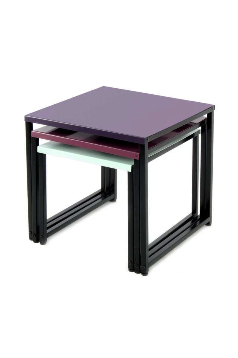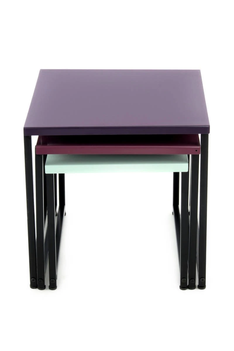 Mit diesem Tisch-Set erhalten Sie gleich drei, farblich perfekt aufeinander abgestimmte Tische. Diese können ineinander verschachtelt werden oder als drei einzelne Tische fungieren. Die Tischplatten präsentieren sich in Pflaume, Violett und Mint und machen sowohl einzeln als auch in Kombination eine herausragende Figur. Das Tisch-Set ist eine stilvolle Ergänzung für jede Einrichtung und kann flexibel verwendet werden. Das pulverbeschichtete Metallgestell verspricht langjährige Freude an den Produkten. Setzen Sie farbliche Akzente mit diesem tollen Tisch-Set.