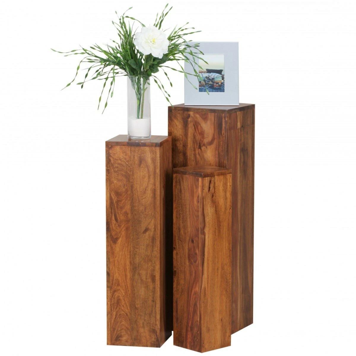 Ein attraktives Set von drei Beistelltischen. Die säulenartigen Tische aus massivem Sheeshamholz haben einen besonders festen Stand und stehen sehr robust dar. Ob diese einzeln odewr kombiniert stehen ist Ihnen überlassen.