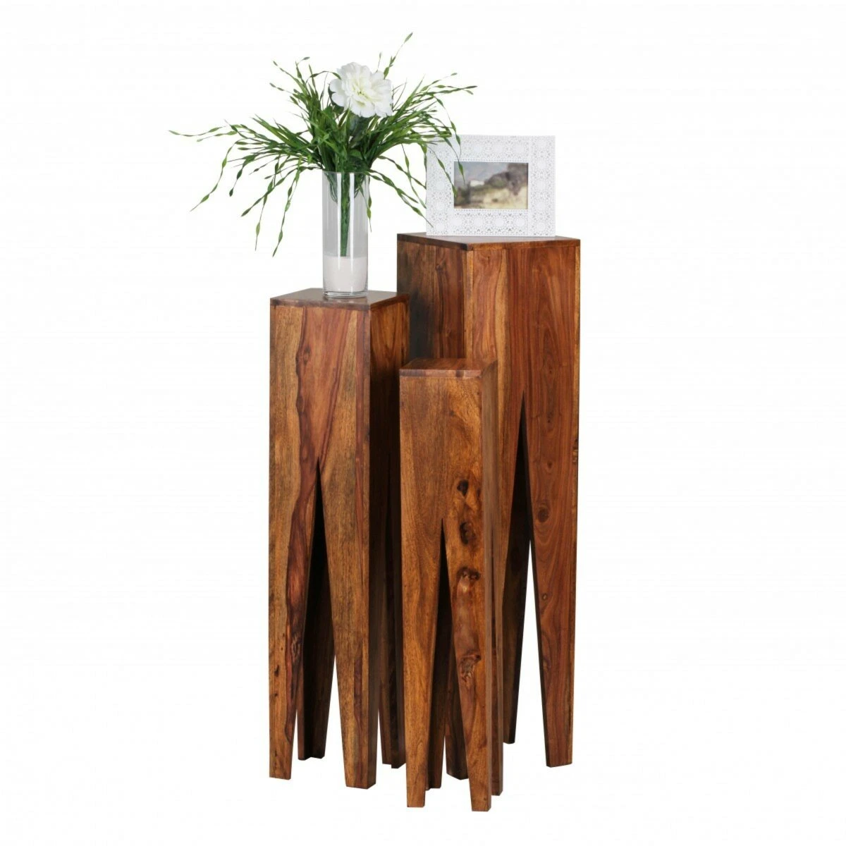 Attraktive Beistelltische, die alleinstehend und in Kombination eine gute Figur machen. Durch die giraffenartigen Standbeine werden die Beistelltische optisch vergrößert und eignen sich hervorragend um kleine Utensilien und Dekorationen dekorativ in Szene zu setzen. Das massive Sheeshamholz hat einen einzigartigen Charakter und weist durch das braune Beizen noch seine natürlichen Maserungen auf. Hierdurch ist jedes einzelne Exemplar ein Unikat. Die Ablageflächen sind in quadratischer Form.