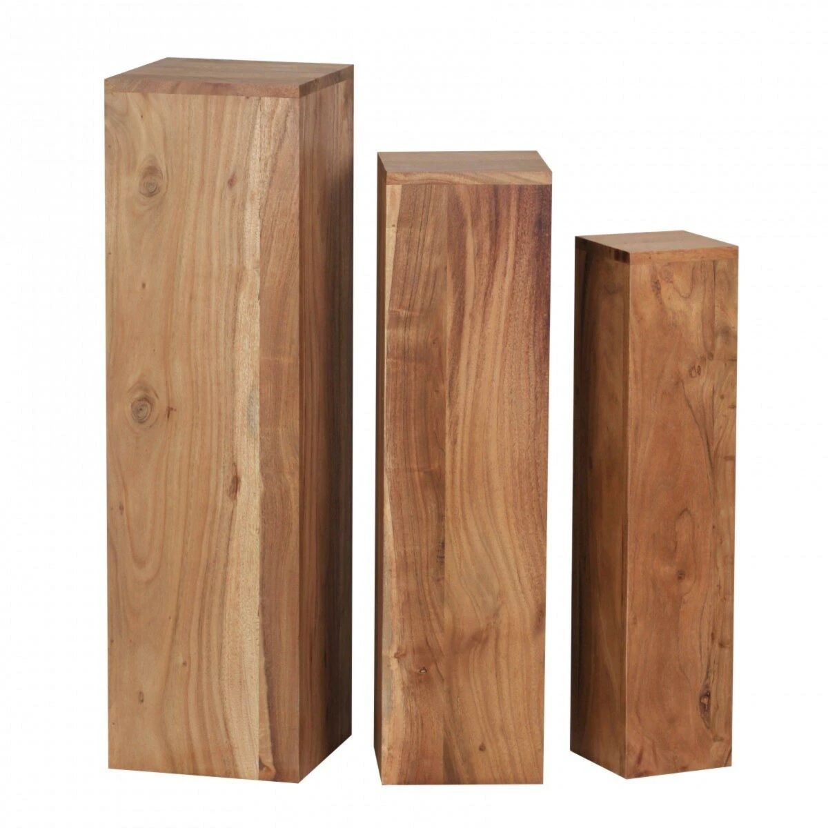 Ein attraktives Set von drei Beistelltischen. Die säulenartigen Tische aus massivem Akazienholz haben einen besonders festen Stand und stehen sehr robust dar. Ob diese einzeln oder kombiniert stehen ist Ihnen überlassen.
