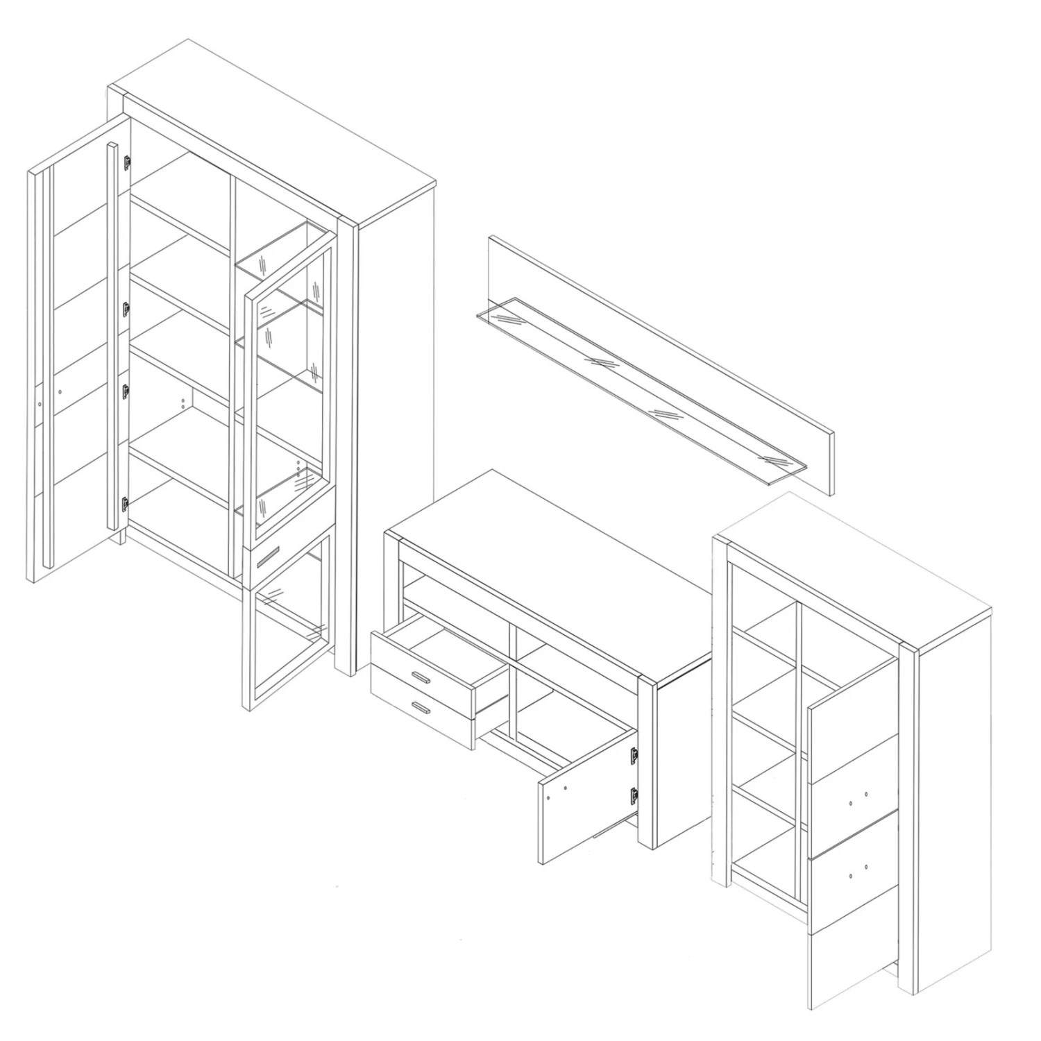 Die Wohnwand aus der Serie HARTFORD kombiniert 4 verschiedene Elemente in ein Gesamtpaket und ist dadurch ein echter Allrounder. Die Kommode und die Hochvitrine punkten durch ihre Geräumigkeit und durch ihre Flexibilität. Beide Möbel bieten die Möglichkeit Gegenstände in Szene zu setzen und Gegenstände zu verstauen. Das Wandregal ermöglicht es, zusätzliche Gegenstände zu präsentieren. Das Lowboard rundet das Gesamtpaket durch ein Stellplatz für Ihr TV-Gerät ab.