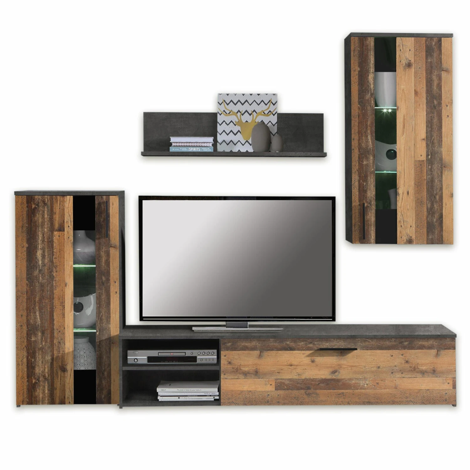 Mit dieser 4-teiligen Wohnwand holen Sie sich moderne Möbelstücke in Ihrem Wohnraum. Die folierte Oberfläche setzt sich aus Old Wood Vintage und einem Absatz in Betonoptik zusammen. Das Ergebnis ist eine topmoderne Optik, die sich in Ihrem Wohnzimmer widerspiegeln wird. Nicht nur optisch kann diese Wohnwand überzeugen, sondern auch die Geräumigkeit. Diese finden Sie in einem Standelement mit zwei Glasböden, im TV-Lowboard mit zwei Gerätefächern, in der Hängevirtrine und auf dem Wandboard.