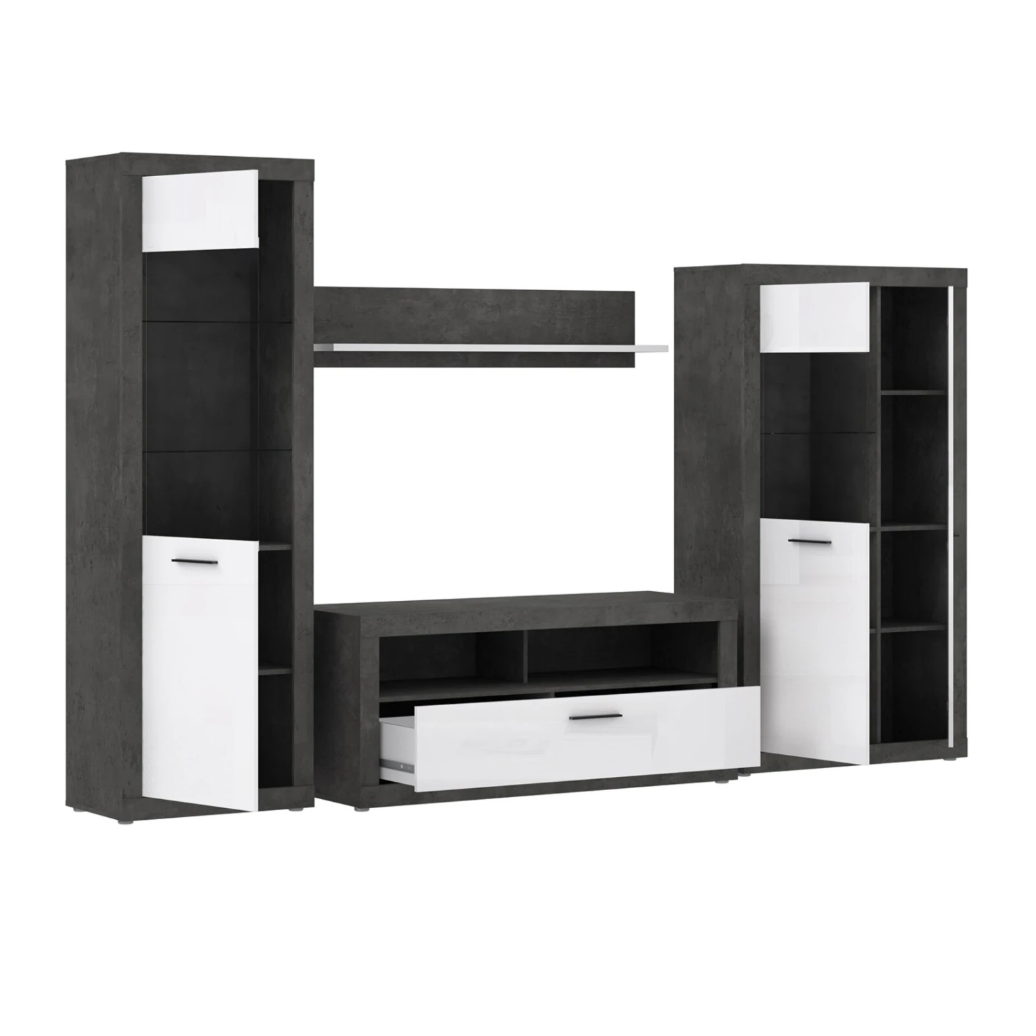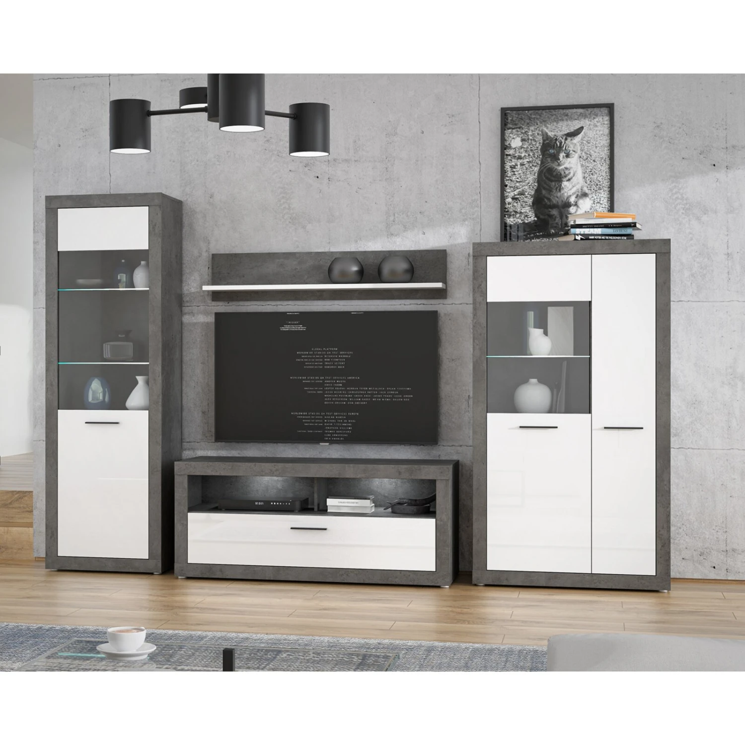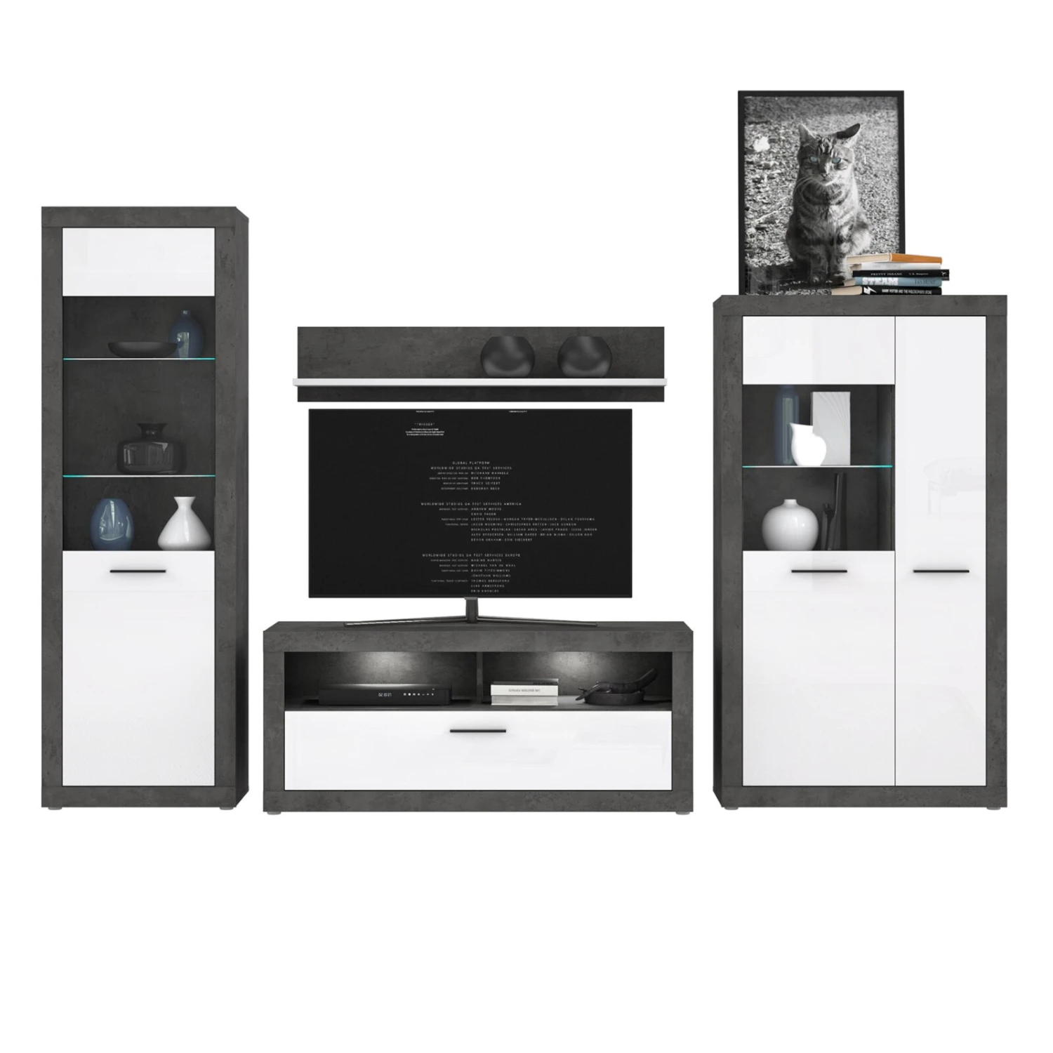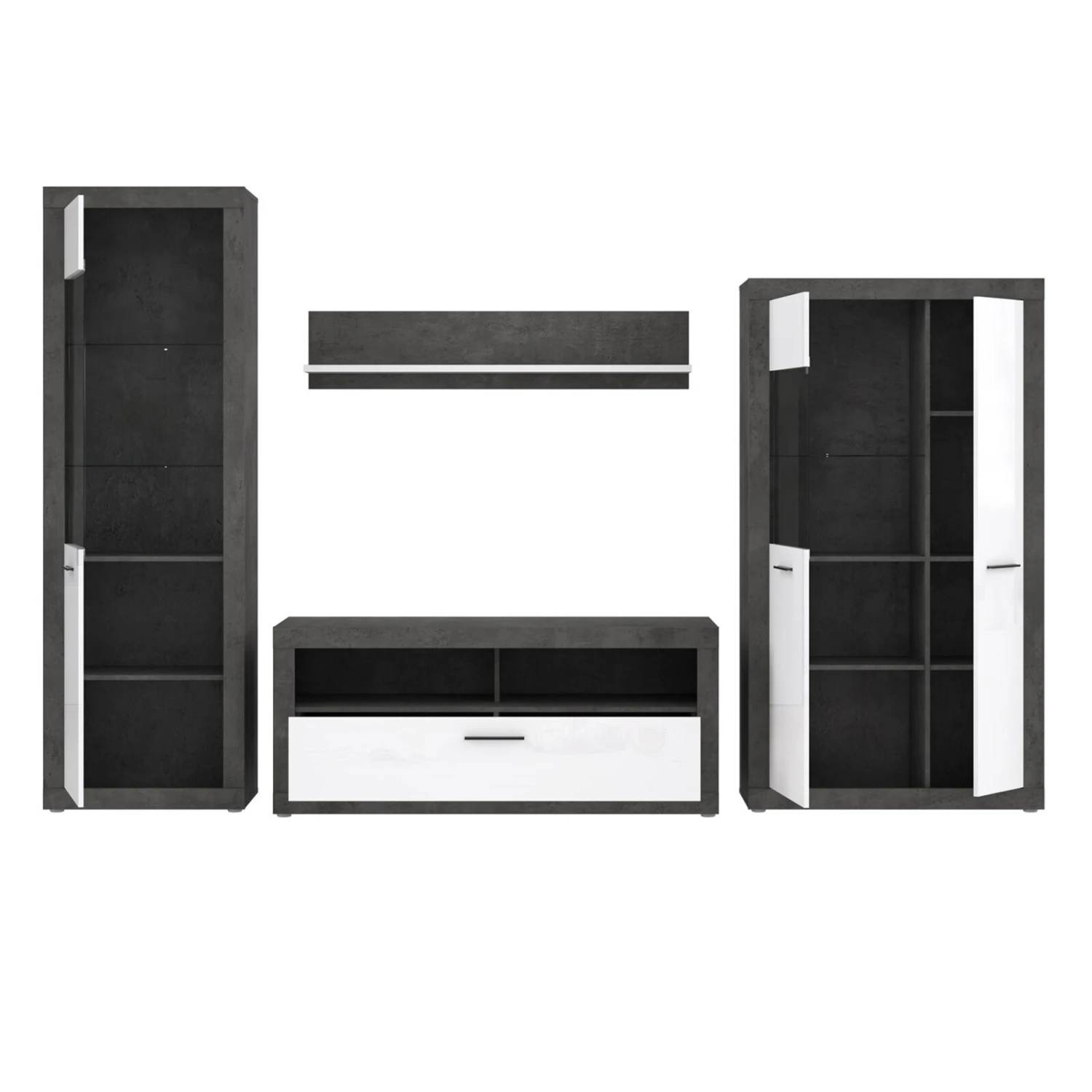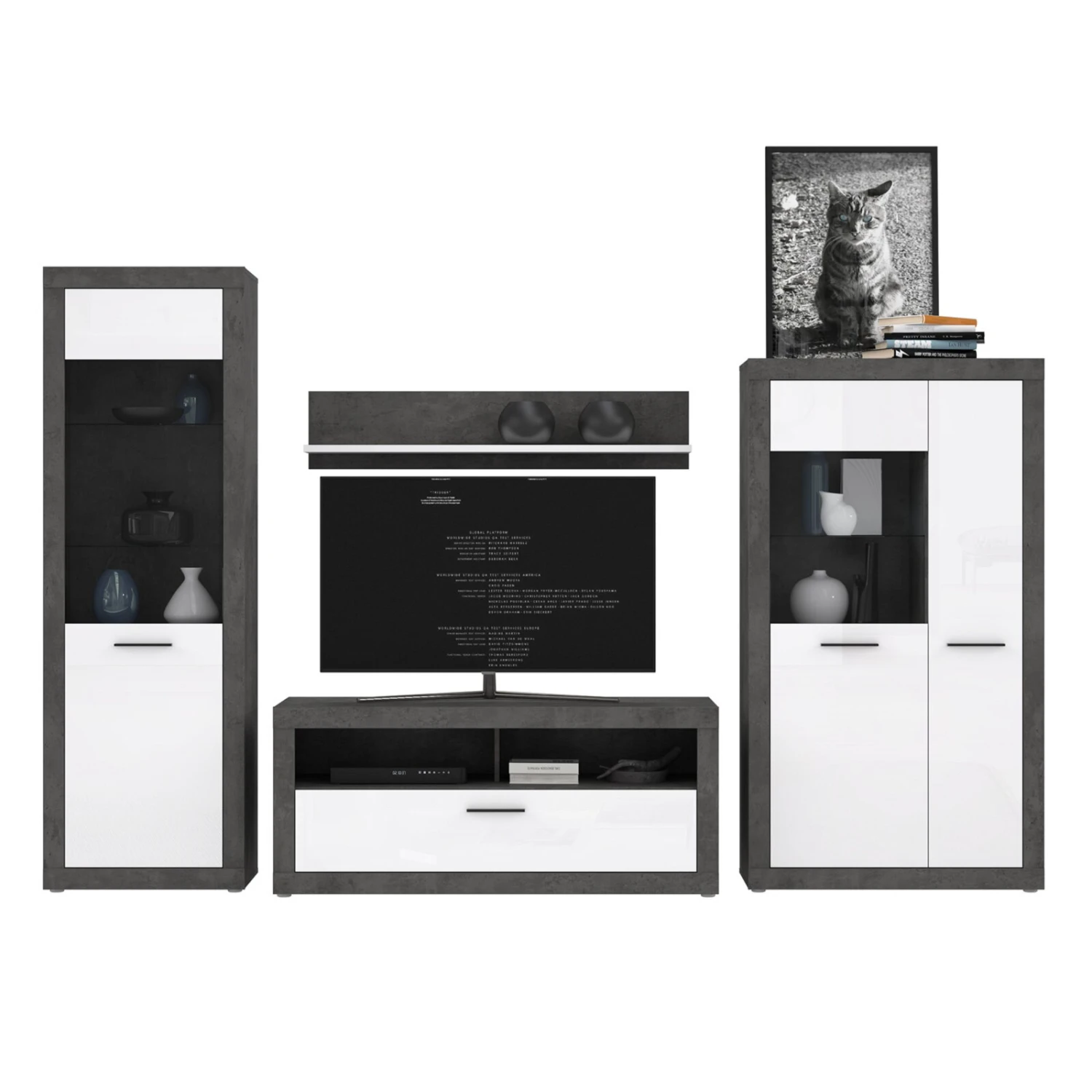Dieses 4-teilige Wohnwand-Set wertet Ihr Wohnzimmer um ein vielfaches auf! Das Design aus Betonoptik und weißen Hochglanzfronten verwandelt Ihr neues Wohnzimmer in einen echten Hingucker. Sie verfügen fortan über ausreichend Stauraum, dafür steht eine Standvitrine, ein Lowboard und eine Highboardvitrine zur Verfügung. Abgerundet wird der hochwertige Eindruck durch das Wandboard, auf dem Sie nach Belieben verschiedene Dekoelemente aufstellen können.