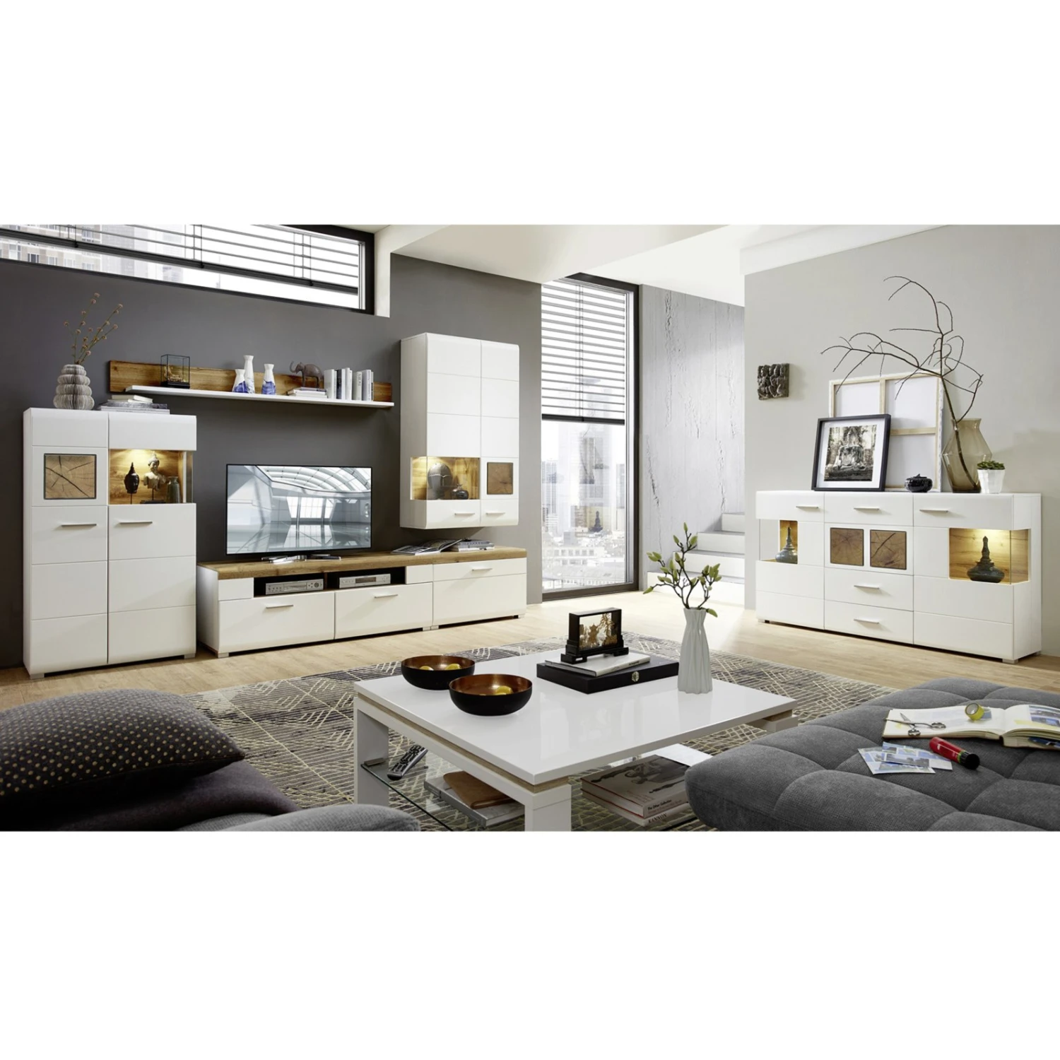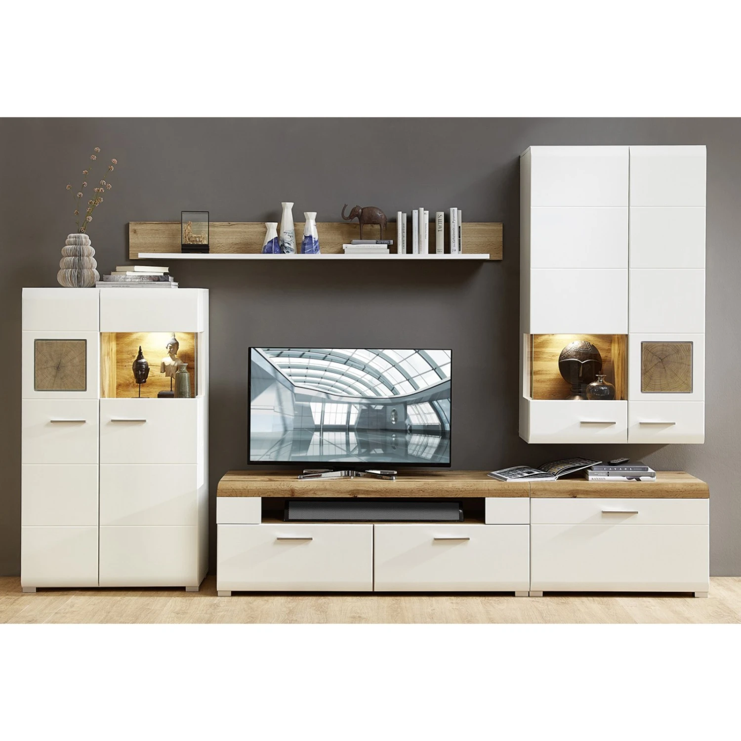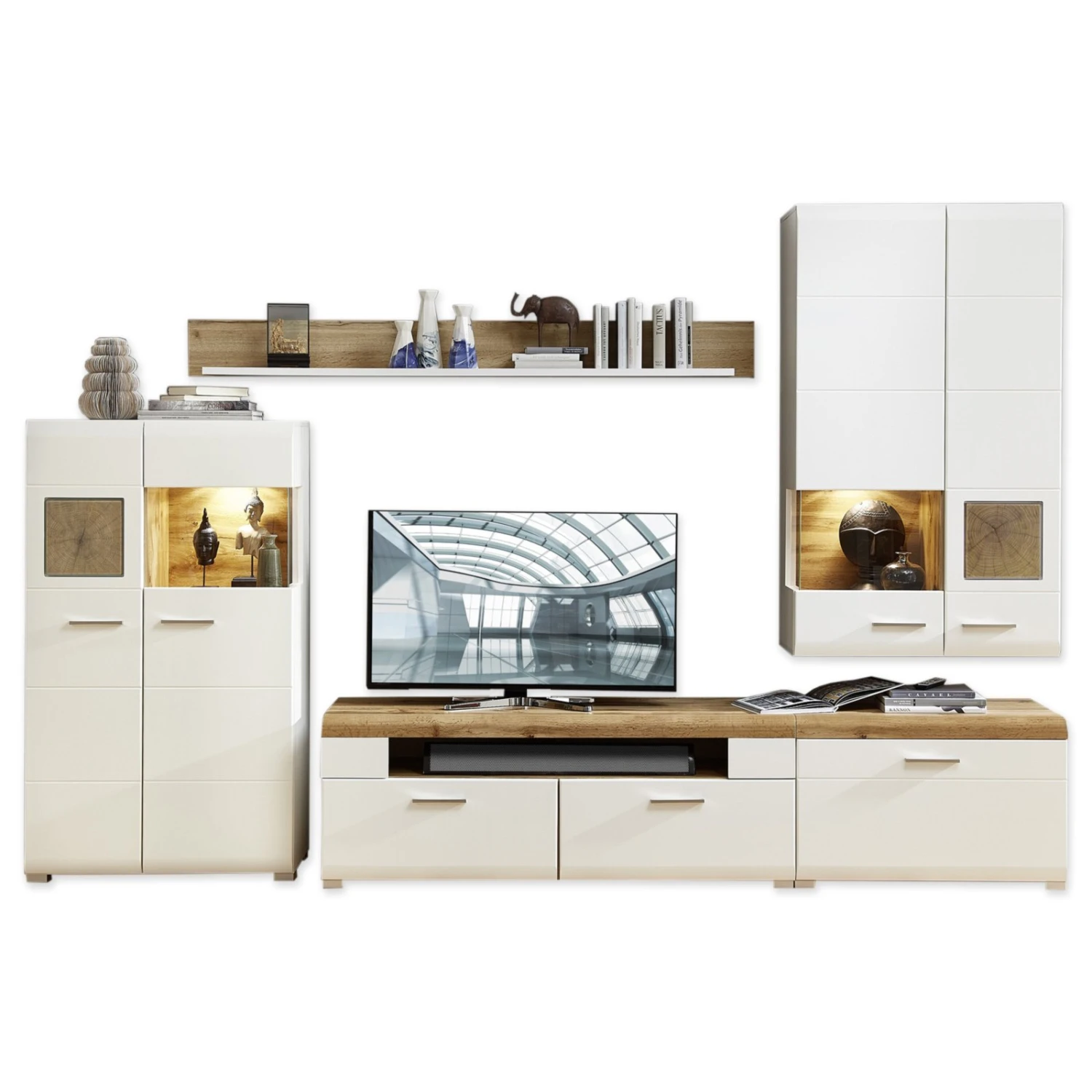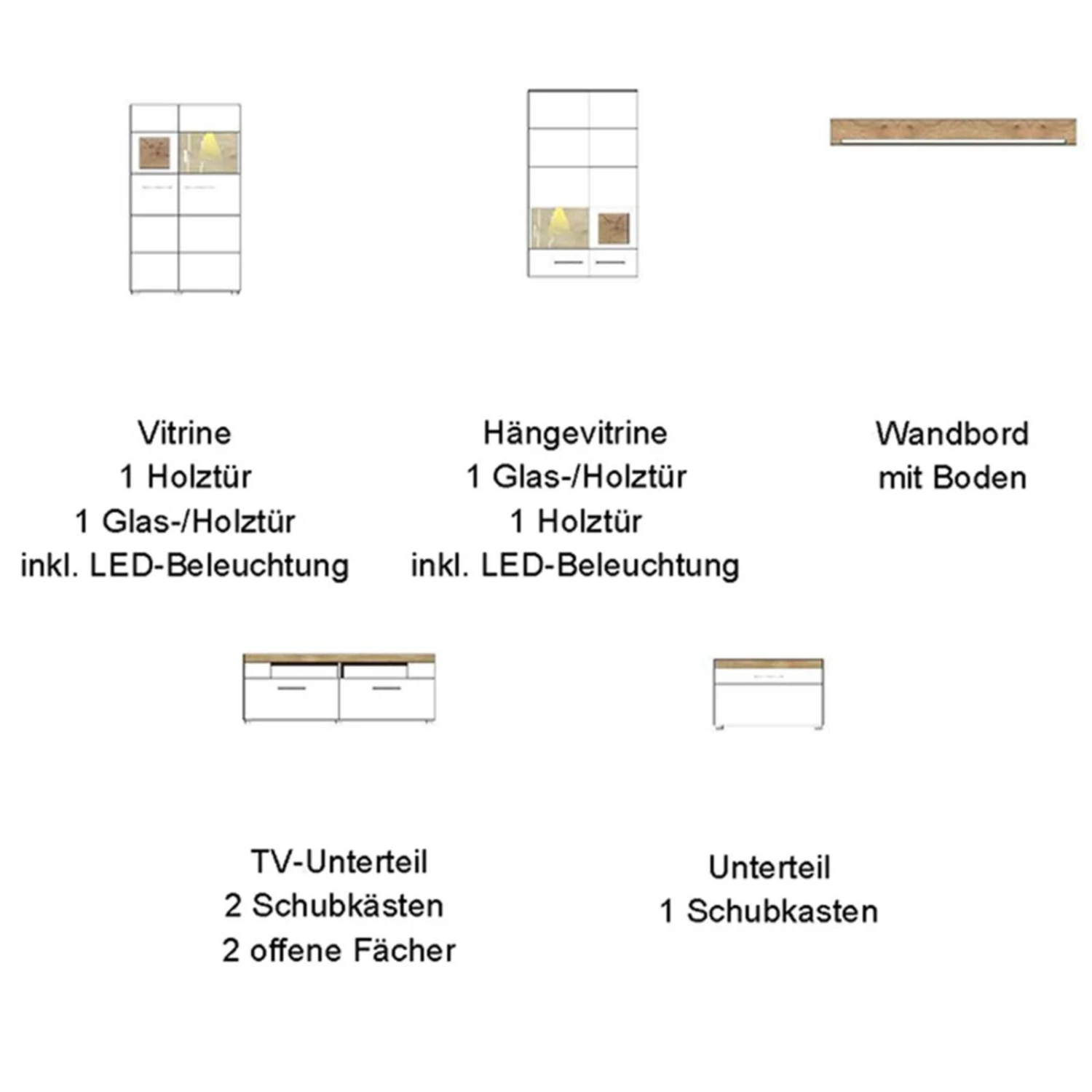 5-teilige Wohnwand – weiß – Eiche Altholz