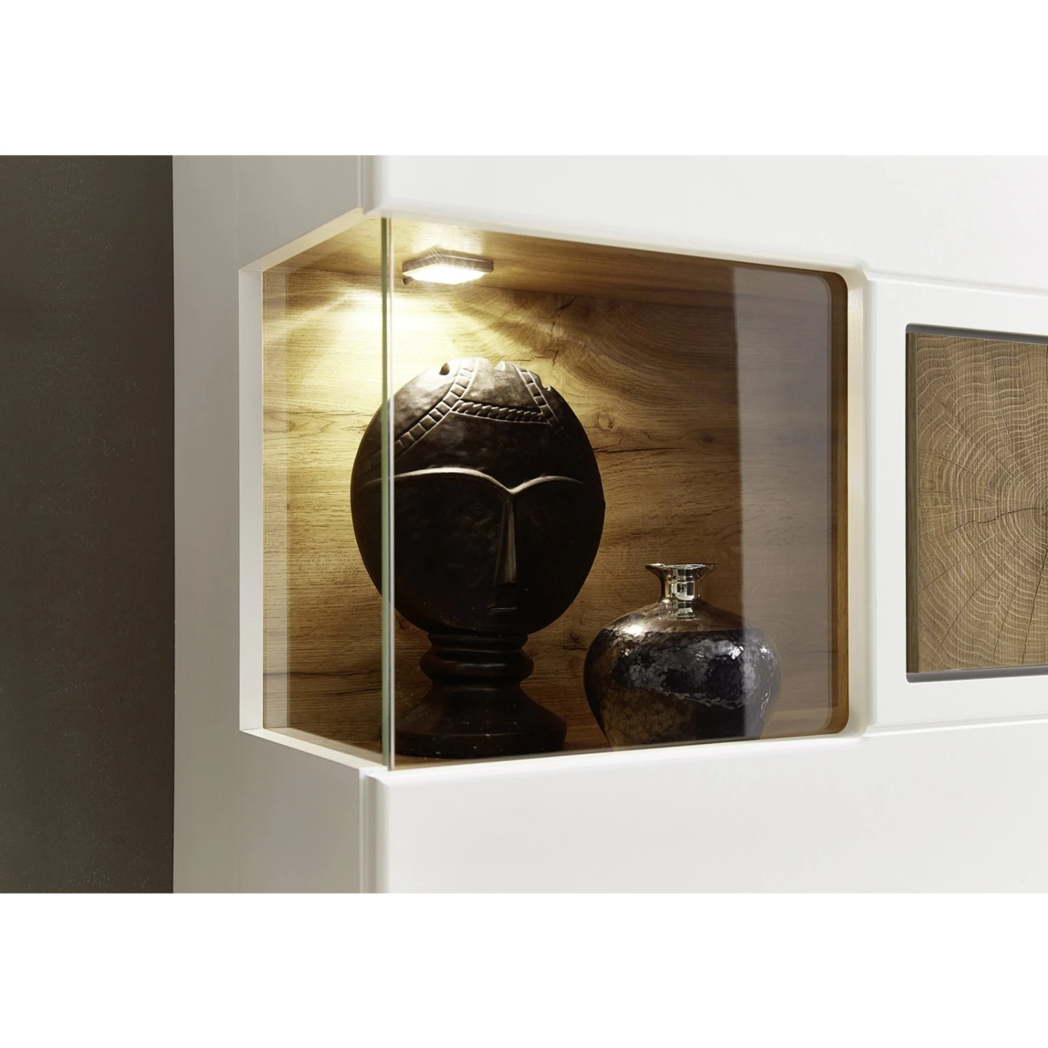 Die 5-teilige Wohnwand ist überwiegend in einem matten und zeitlosen Weiß gehalten. Die Absätze in Eiche Altholz und Hirnholz Nachbildung verleihen diesem Set eine rustikale Optik, die sich in Ihrem Wohnraum widerspiegeln wird. Im Lieferumfang befindet sich eine Standvitrine, ein Wandboard, zwei Unterteile und eine Hängevirtrine. Die Schränke bieten reichlich Platz, um Ihre Utensilien und Gebrauchsgegenstände zu verstauen. Auf dem Wandboard können Sie Ihre Bilder und Dekorationen in Szene setzen.
