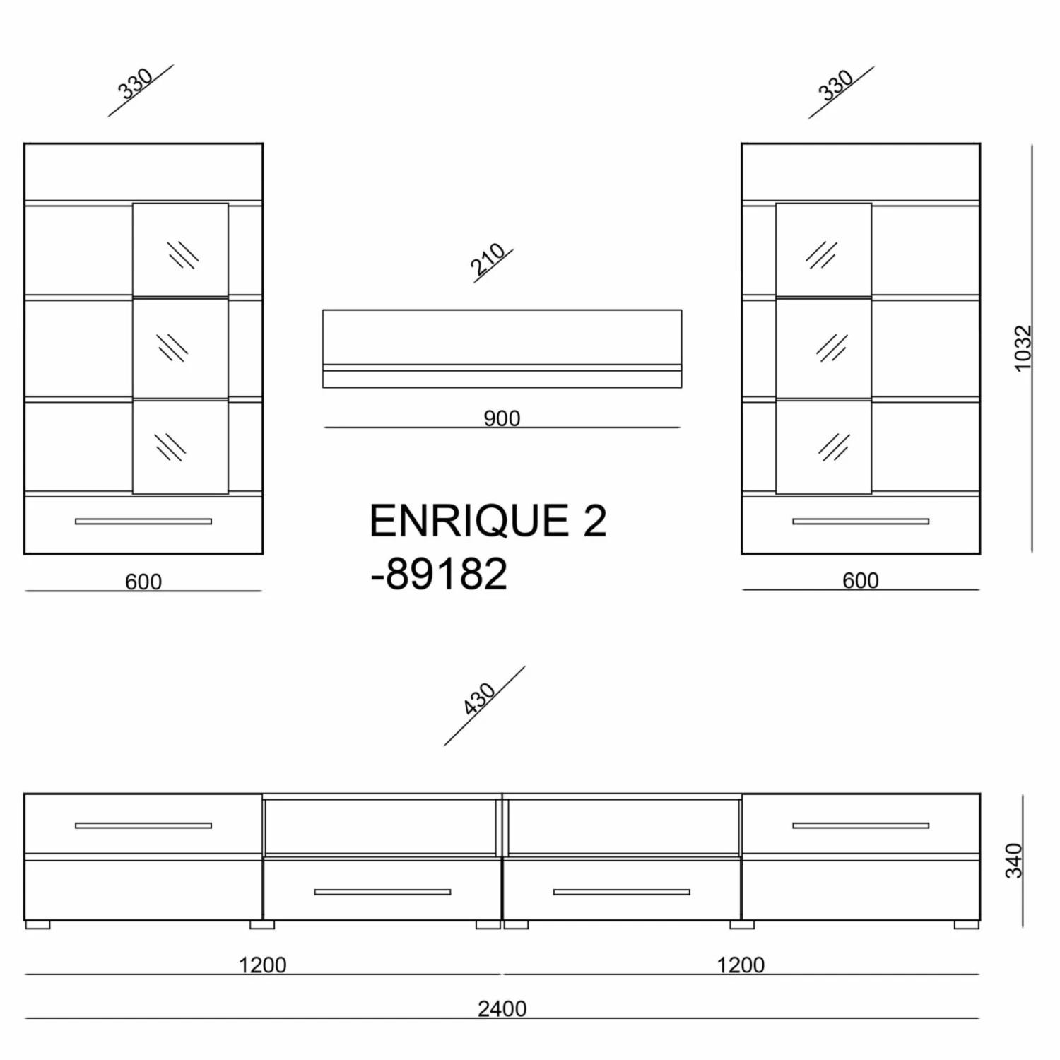 - bestehend aus 2 Lowboards, 2 Hängevitrinen und einem Wandpaneel