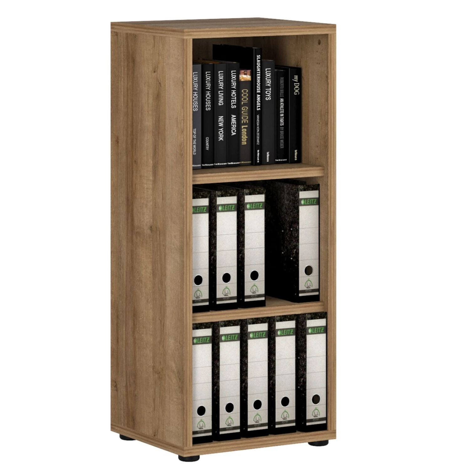 Egal ob als Akten- oder Bücherregal, dieses Möbelstück bietet mit insgesamt drei Fächern reichlich Staurammöglichkeiten für die verschiedensten Utensilien und eignet sich auch bestens für Dekorationen.