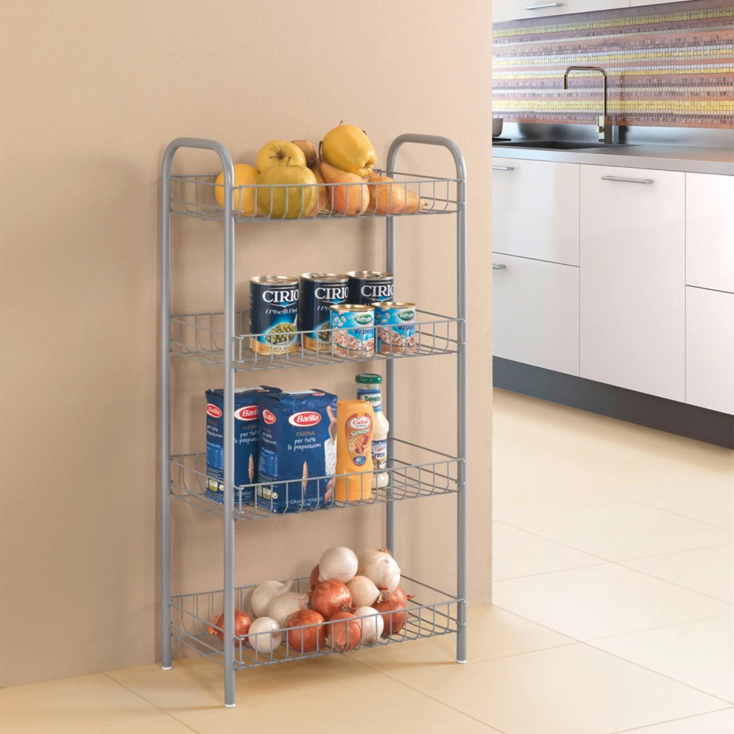 Dieses Allzweckregal kann in den verschiedensten Räumlichkeiten genutzt werden und stellt ein idealen Lagerort für die unterschiedlichsten Utensilien dar. Zudem lässt sich die silberne Optik mit vielen Einrichtungen kombinieren.
