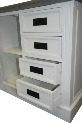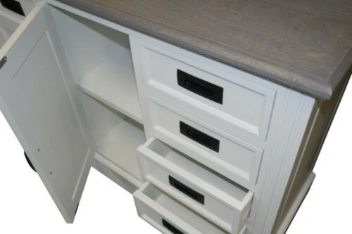 Viel Stauraum durch 8 praktische Schubladen sowie ein Ablageboden hinter der Tür zeichen diese Anrichte vorrangig aus. Die auf Holzleisten laufenden Schubladen sind einfach zu öffnen dank der schwarzen Kunststoffeingriffe. Die braune obere Holzplatte mit grau gewischten Akzenten lädt zum dekorieren ein.