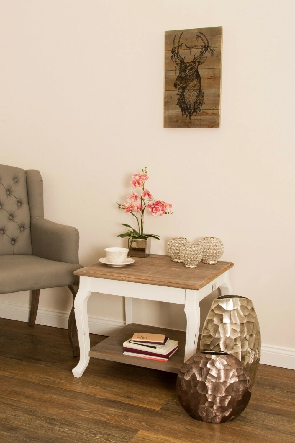 Der Beistelltisch ADRIANA wurde für Sie in liebevoller Handarbeit zusammengefügt. Das weiße Gestell mit den geschwungenen Beinen und die einzelnen Tischpaneele in Naturtönen, die als Ganzes die Tischplatte und die Ablagefläche ergeben.