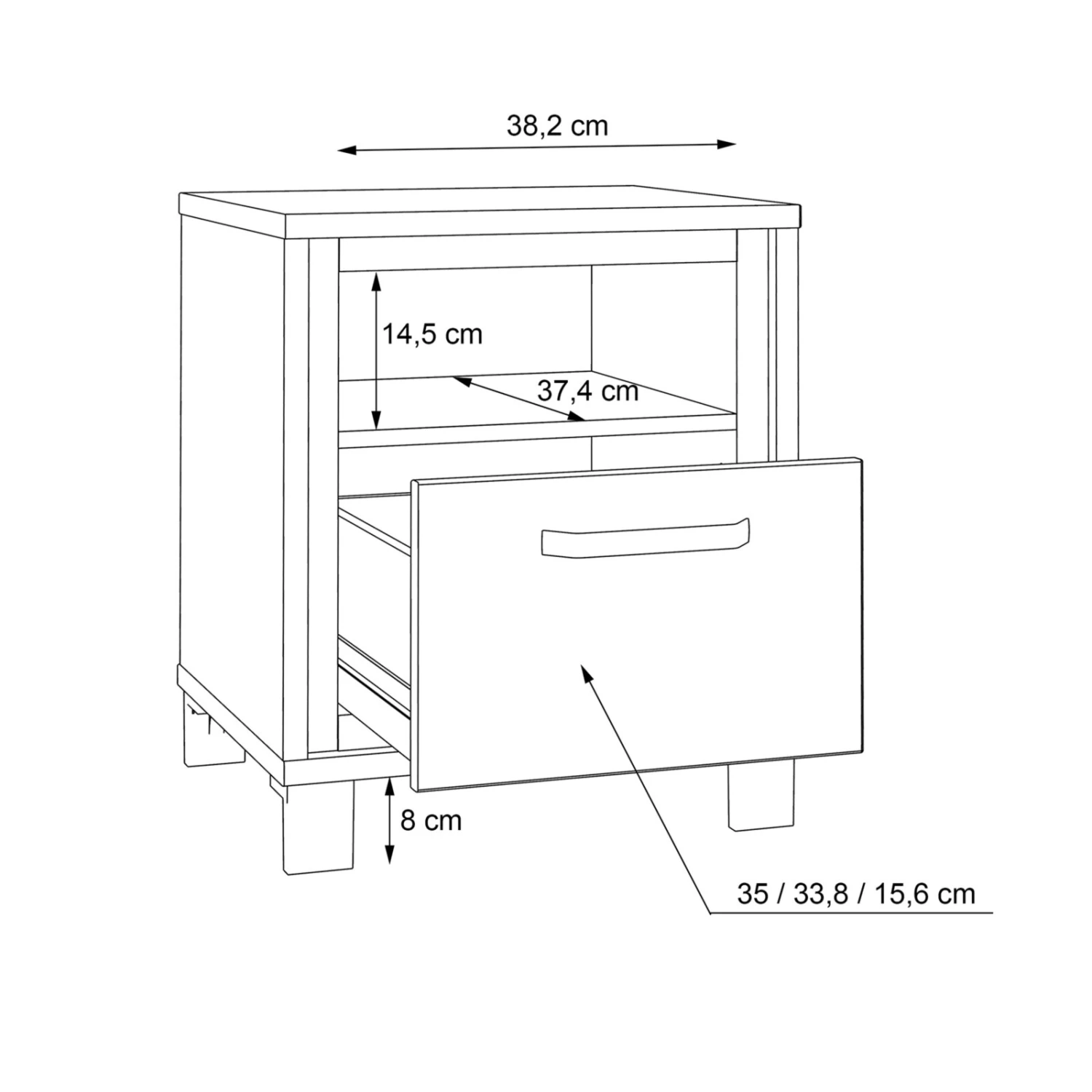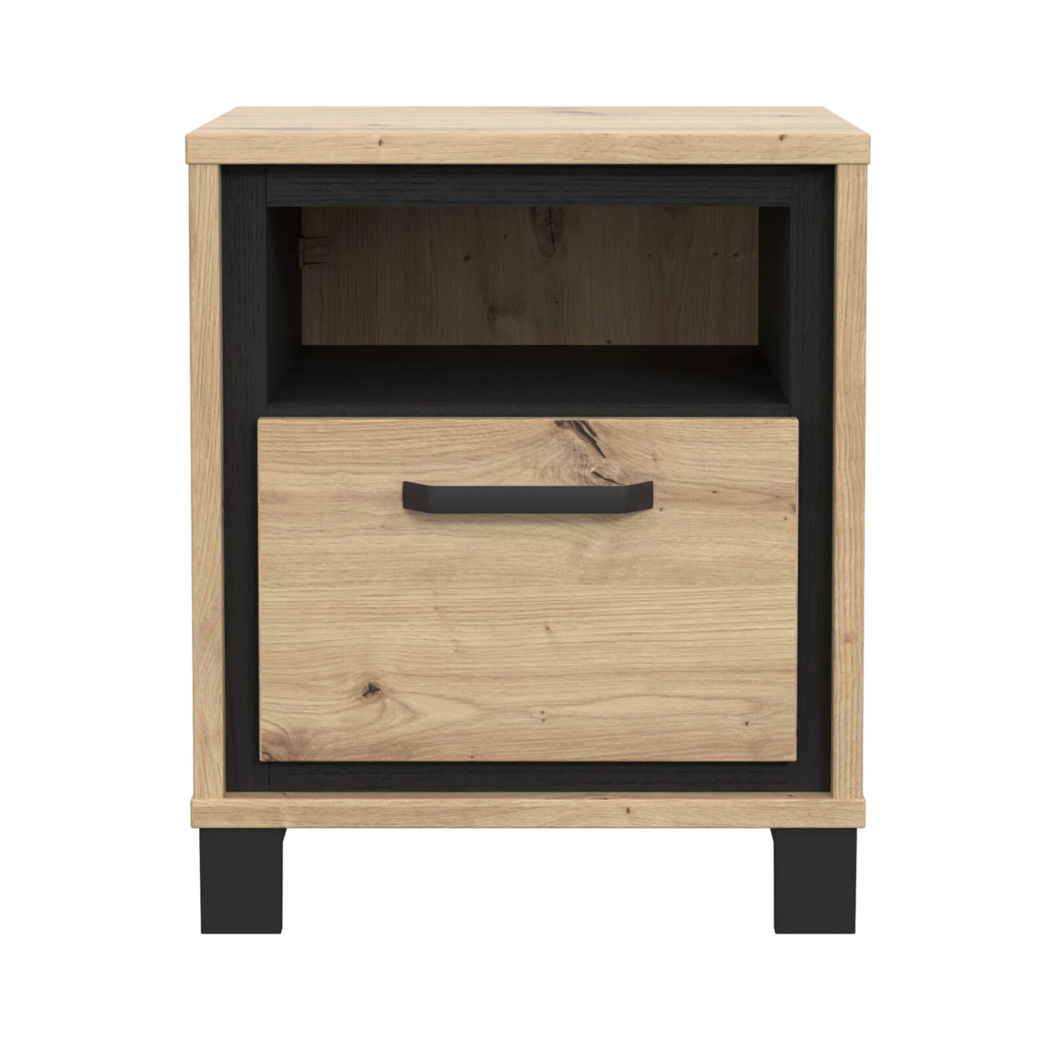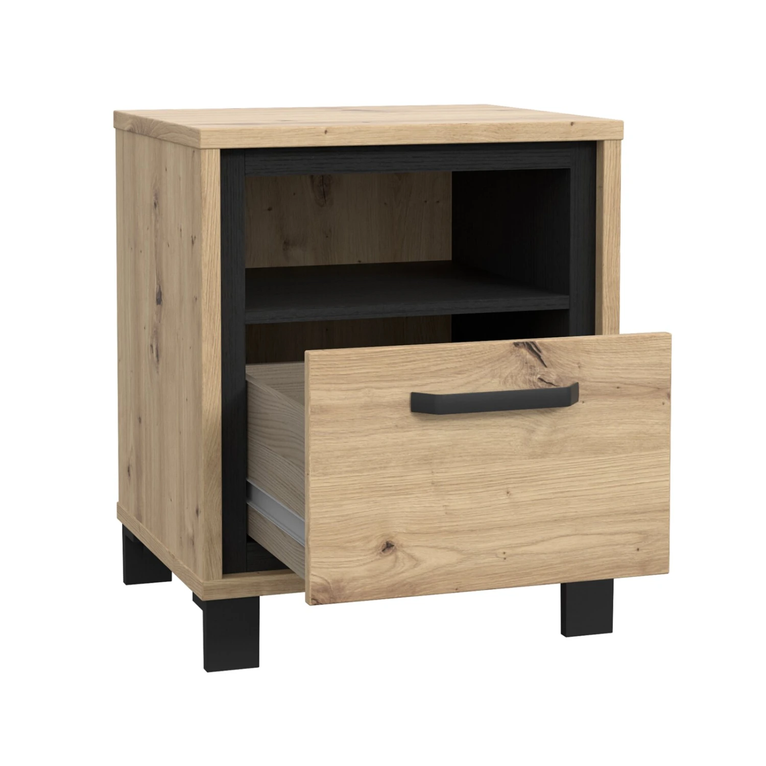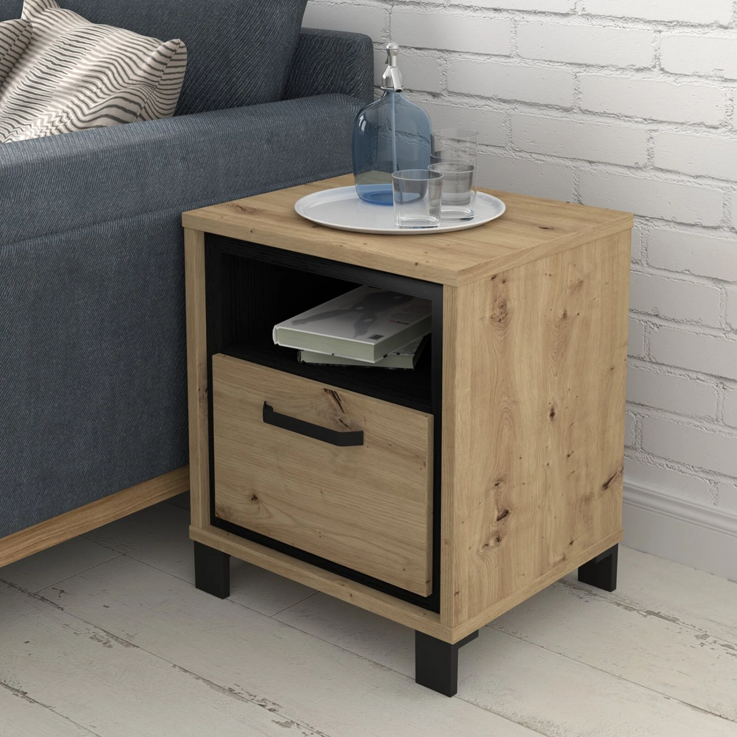 Moderner Beistelltisch mit einem besonderem industriellen Look. Die Kombination aus Artisan Eiche Nachbildung und Schwarzeiche Nachbildung kreiert einen unvergleichlichen Charme in Ihrem Wohnraum. In einem offenen Fach sowie einem Schubkasten können Sie Utensilien unterbringen.