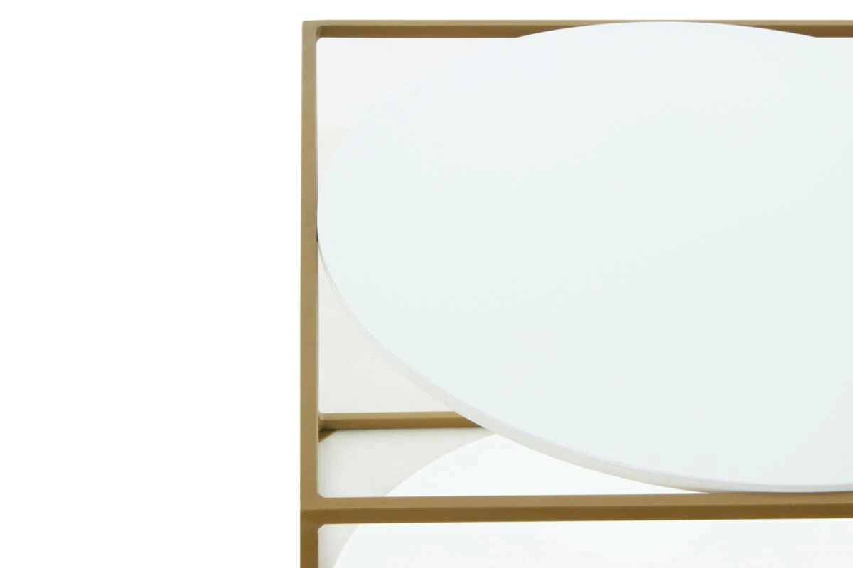 Hier funkeln das Gestell in einem warmen Goldton und die Platten in einem strahlenden Weiß um die Wette. Trotz geometrischer Unterschiede stehen bei diesem Beistelltisch Gestell und Tischplatten in Harmonie miteinander. Die beiden Glasplatten können Sie als Ablagen oder als Dekorationsflächen nutzen, denn bei einer maximalen Belastbarkeit von ca. 15 kg, sind Ihrer Phantasie kaum Grenzen gesetzt. Mit einer Höhe von ca. 36 cm eignet er daher sich als Couchtisch, als Nachttisch, in Ihrem Eingangsbereich für Dekoration oder auch im Esszimmer als optische Highlight in der Ecke mit Ihren persönlichen Bildern.