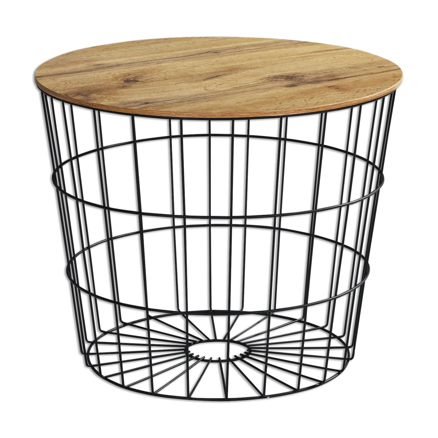 Dieser Beistelltisch ist mit seinem schwarzen Metallgestell und seiner Tischplatte in Eiche dunkel Nachbildung ein Beistelltisch mit herben Charme. Die Tischplatte aus Holz kann einfach abgehoben werden und das Korbgeflecht kann zusätzlich als Stauraum verwendet werden. Auch schöne Dekorationen wie zum Beispiel Lichterketten können hier gut platziert werden.