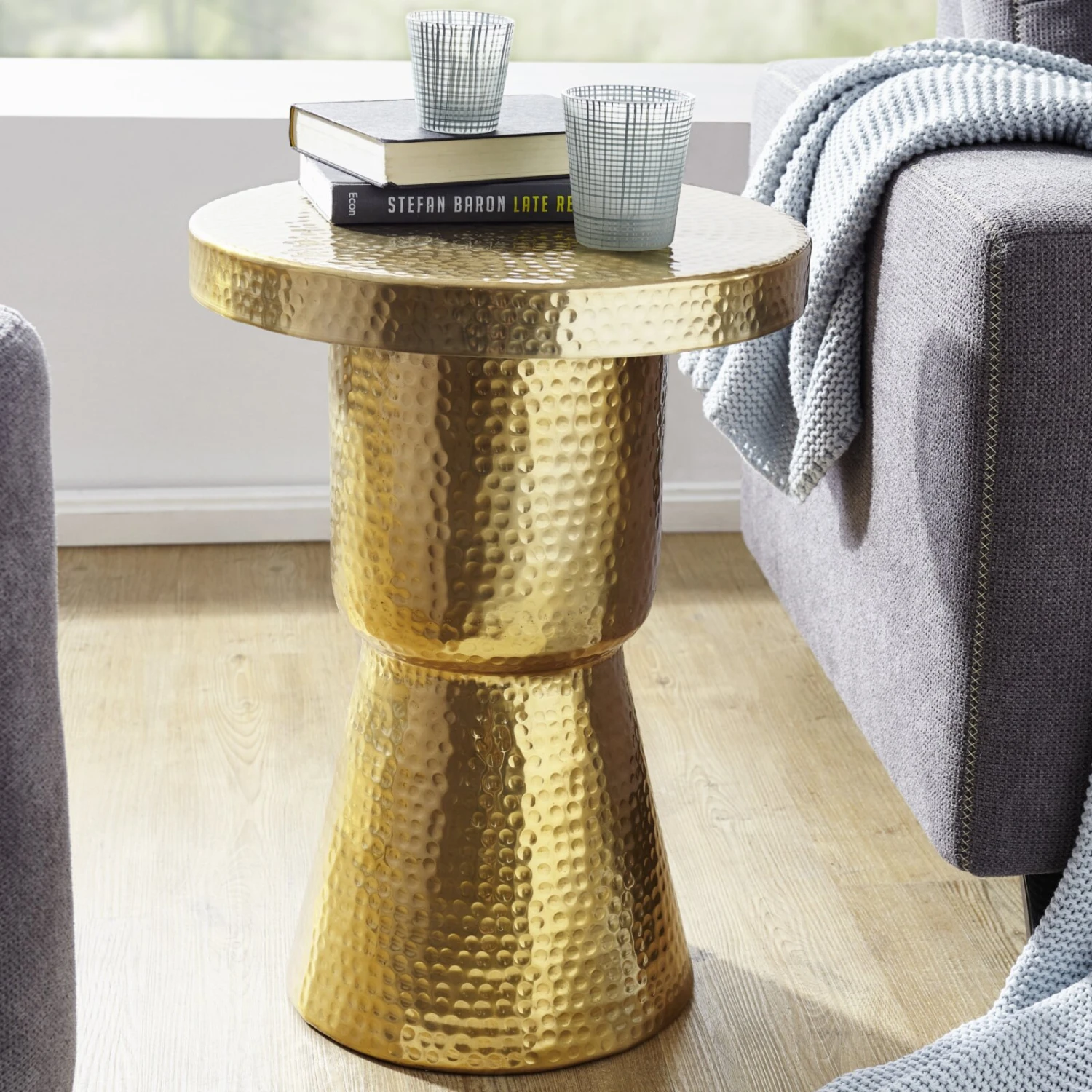 Der goldfarbene Beistelltisch hat eine extravagante Form und fällt somit besonders ins Auge. Auch das Glänzen und das Hammerschlag-Muster sind ein Blickfang. Die Ablageplatte hat einen Durchmesser von etwa 43 cm und eignet sich hervorragend für Dekorationen oder Zeitschriften.