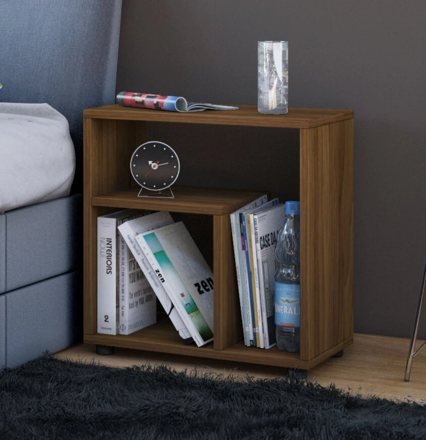 Praktischer und zeitloser Beistelltisch in Kern-Nussbaum Nachbildung. Dieser Tisch ist genau das richtige Möbelstück, um kleinere Utensilien wie eine Fernbedienung oder eine Fernsehzeitung kurzfristig abzulegen. Die Ablage und die zwei offenen Fächer bieten auch reichlich Platz für Dekorationen.