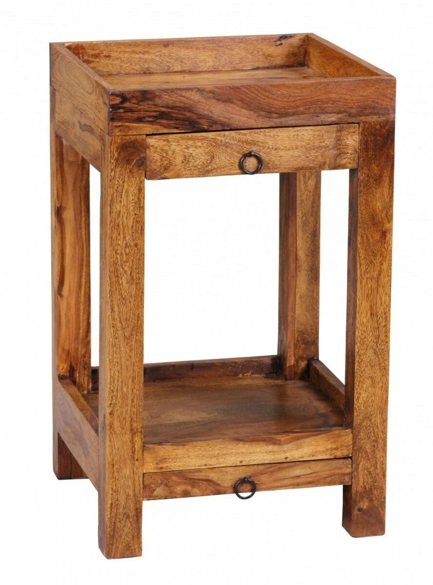 Ein attraktiver Beistelltisch aus massivem Sheeshamholz. Die Oberfläche wurde zum Erhalt der natürlichen Maserung klar lackiert. Der in Handarbeit gefertigte Tisch ist durch die natürliche sichtbaren Bestandteile ein Unikat und wird Sie begeistern. Ausgestattet mit zwei Schubladen und einer Ablage kann der Tisch individuell eingesetzt werden.