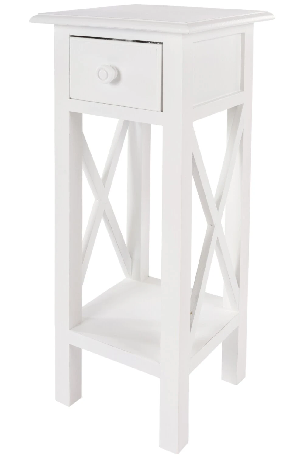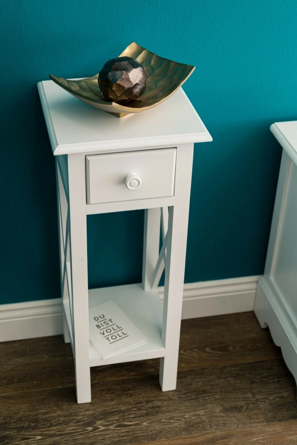 Der weiße Beistelltisch MERIDIAN kann als Beistell- oder Telefontisch verwendet werden. Er ist im Landhaus-Stil gehalten. Dies wird besonders durch seine gekreuzten Streben deutlich. Eine Schublade steht Ihnen für kleinere Utensilien zur Verfügung.