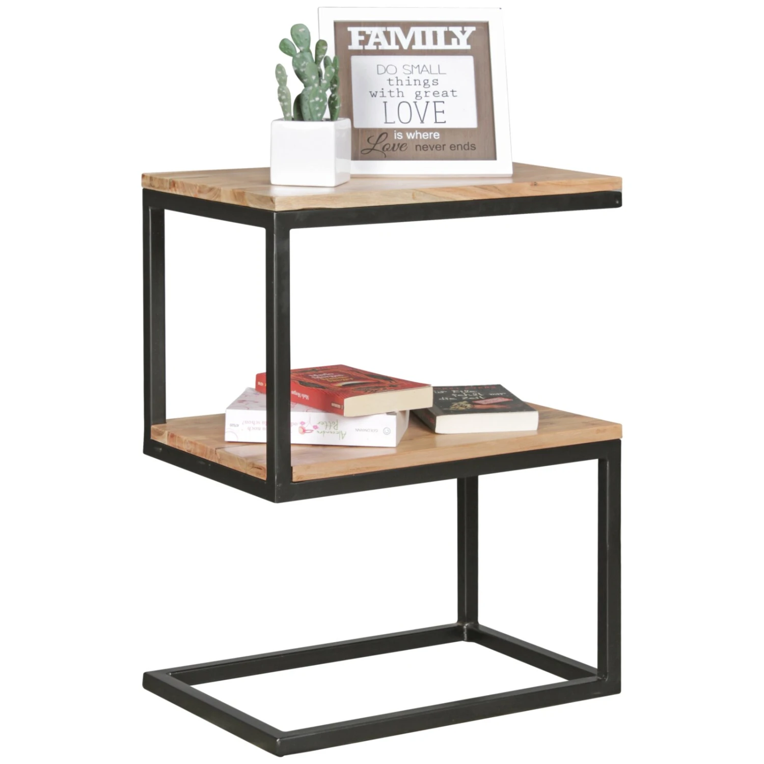 Ein wundervoller Beistelltisch in S-Form. Ein anthrazitfarbenes Metallgestell verleiht dem Tisch einen robusten Charakter. Zwei Tischplatten aus massivem Akazienholz machen aus jedem Exemplar ein Unikat, da die natürliche Maserung des Holzes beim Veredeln erhalten blieb.