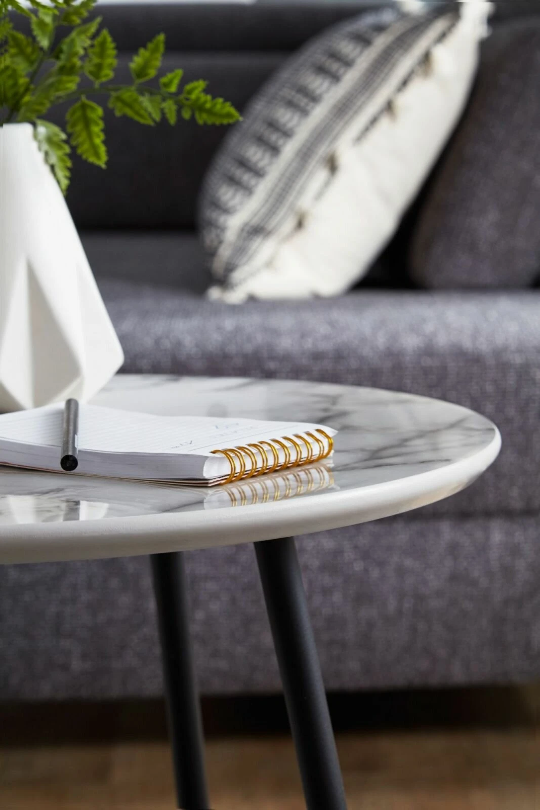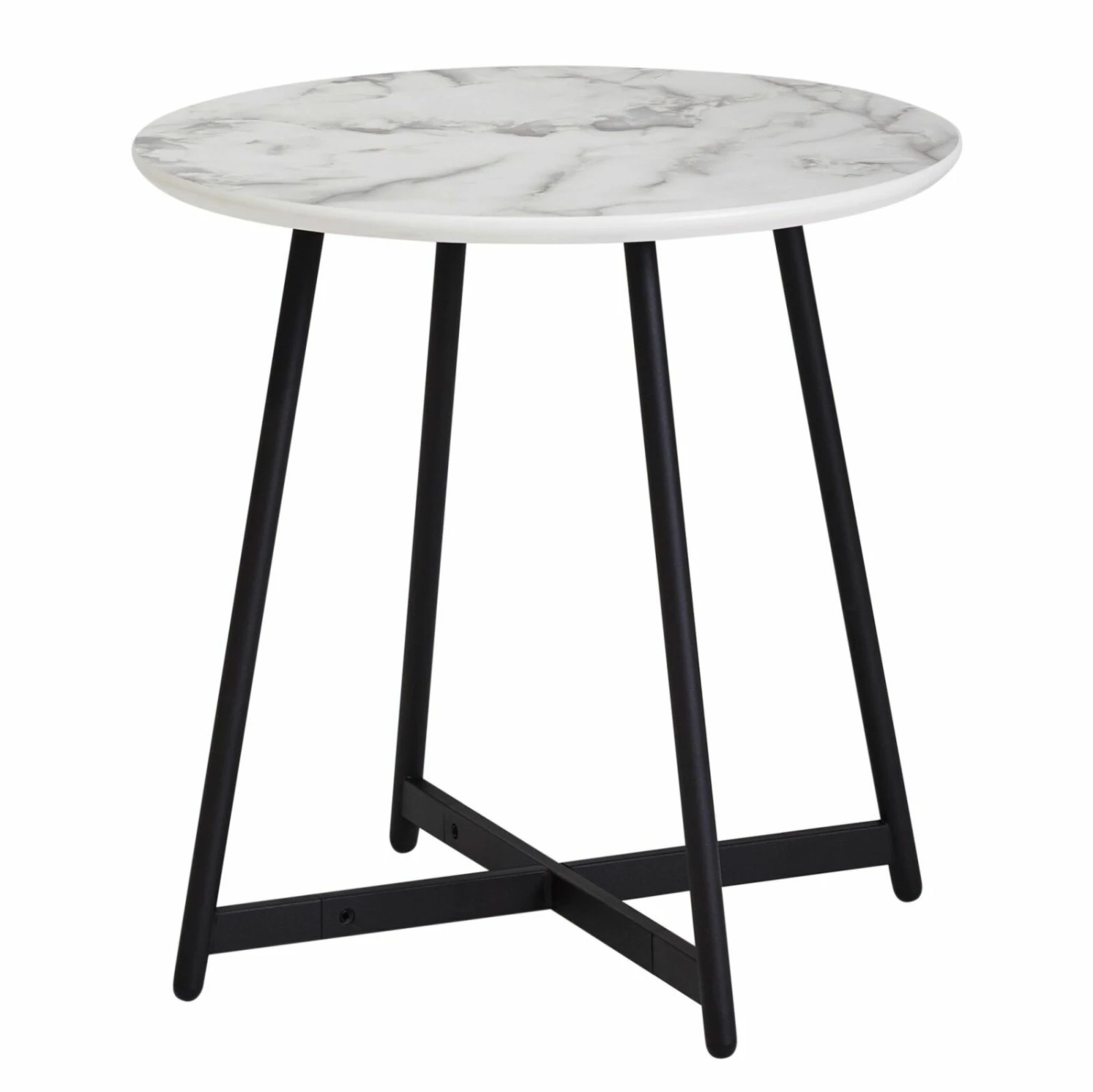 Dieser Beistelltisch besticht durch sein schlichtes und elegantes Design. Sein Gestell aus pulverbeschichtetem Stahl ist trotz seiner Offenheit sehr standfest. Ihr Boden wird durch schwarze Kunststoffkappen am Gestell geschützt, sodass keine Kratzer oder Ähnliches entstehen. Die Tischplatte sticht durch den hohen Kontrast in weißer Marmoroptik mit Hochglanz-Effekt hervor und unterstreicht die Eleganz des Tisches.