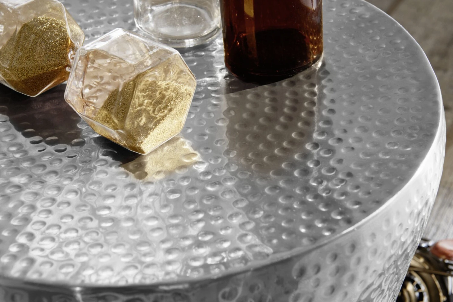 Der modische Beistelltisch mit konischem Korpus ist vielseitig einsetzbar. Seine Ablagefläche kann für Blumen, Dekorationen, Kerzen, Getränke oder viele weitere Utensilien verwendet werden. So macht er sich in vielen Räumen als schicker Haushaltshelfer. Durch das in Handarbeit produzierte Hammerschlag-Muster ist jeder dieser Exemplare ein Einzelstück.