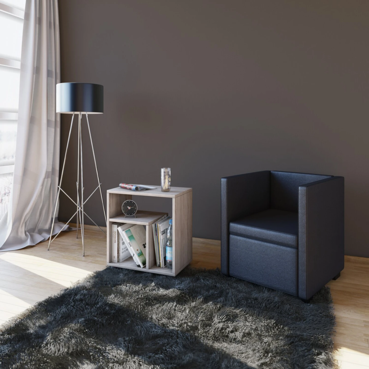 Zeitloser Beistelltisch in Sonoma Eiche Nachbildung. Dieses praktische Möbelstück ist genau das Richtige, um kleinere Utensilien wie eine Fernbedienung oder eine Fernsehzeitung kurzfristig abzulegen. Die Ablage und die zwei offenen Fächer bieten auch reichlich Platz für Dekorationen.