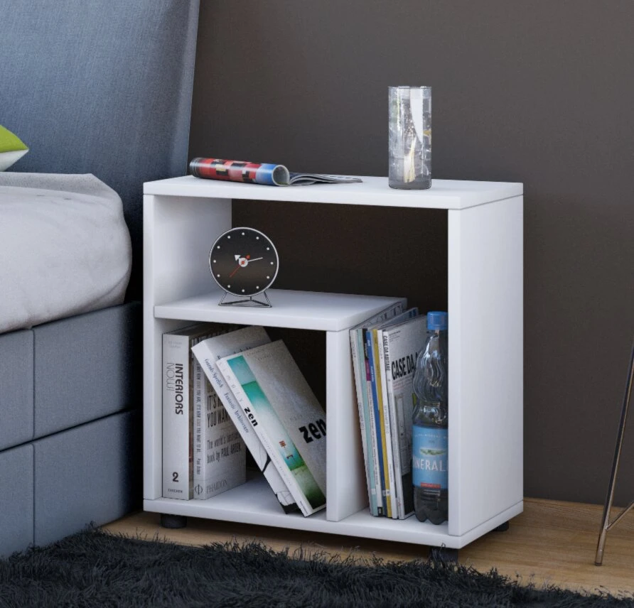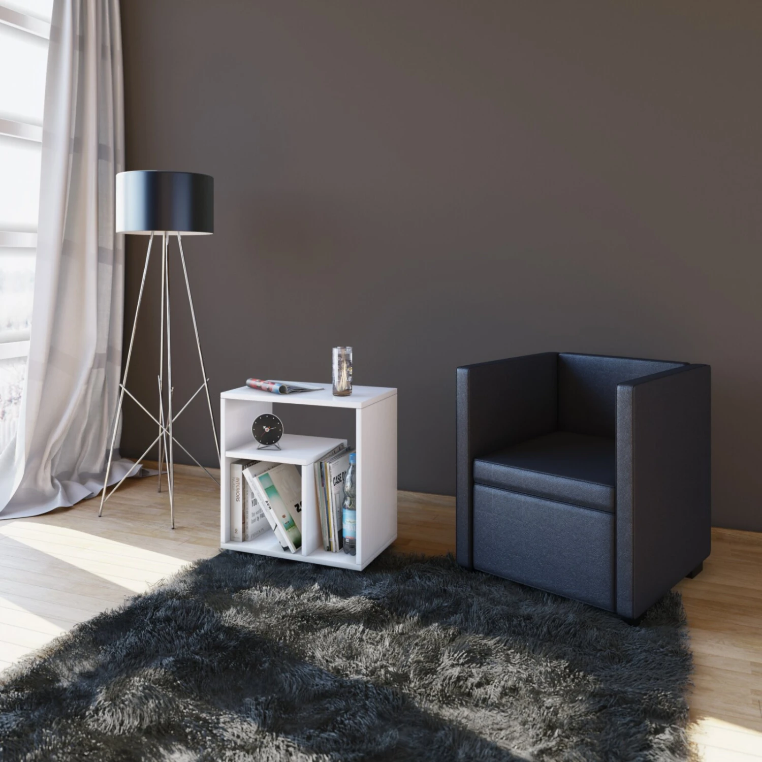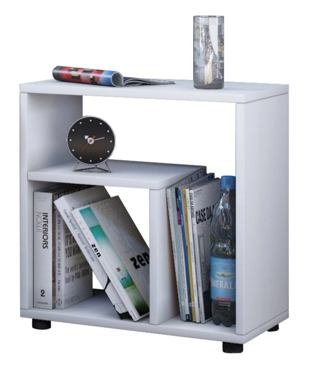 Praktischer und zeitloser Beistelltisch in Weiß. Dieser Tisch ist genau das richtige Möbelstück, um kleinere Utensilien wie eine Fernbedienung oder eine Fernsehzeitung kurzfristig ab zu legen. Die Ablage und die zwei offenen Fächer bieten auch reichlich Platz für Dekorationen.
