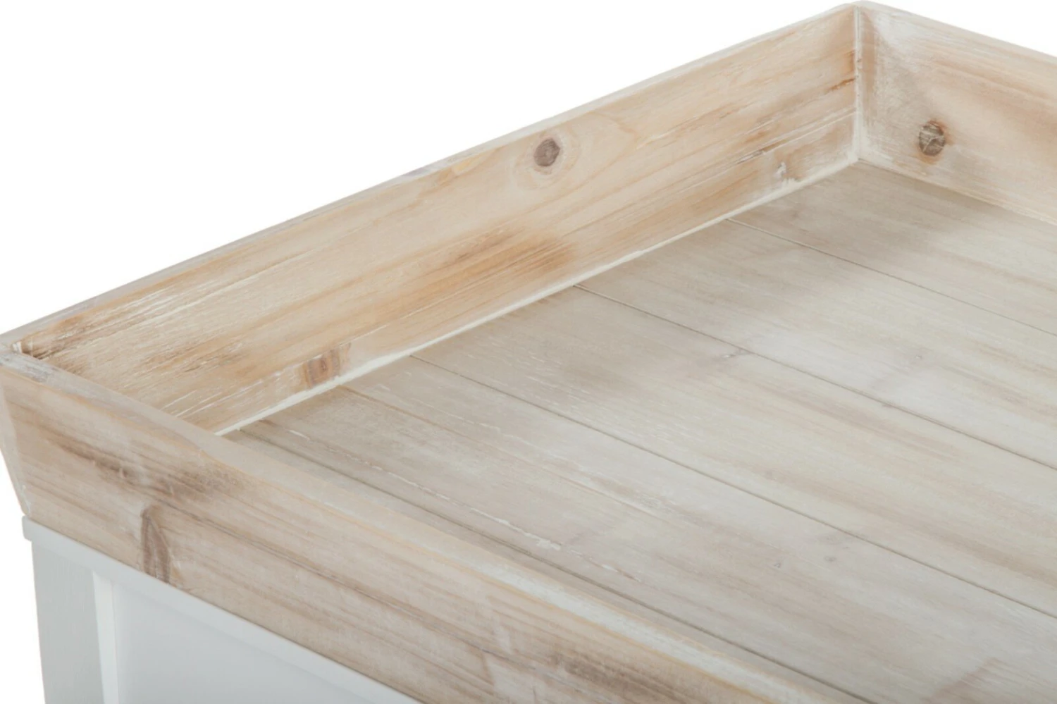 Der Beistelltisch kann bei Bedarf auch als Couchtisch verwendet werden. Das naturfarbene Tablett kann vom Tisch abgenommen werden. Das Tablett verfügt über Leisten, welche in die Aussparungen am Tisch passen. Ein individuell gestaltetes Möbelstück, welches vielseitig eingesetzt werden kann.