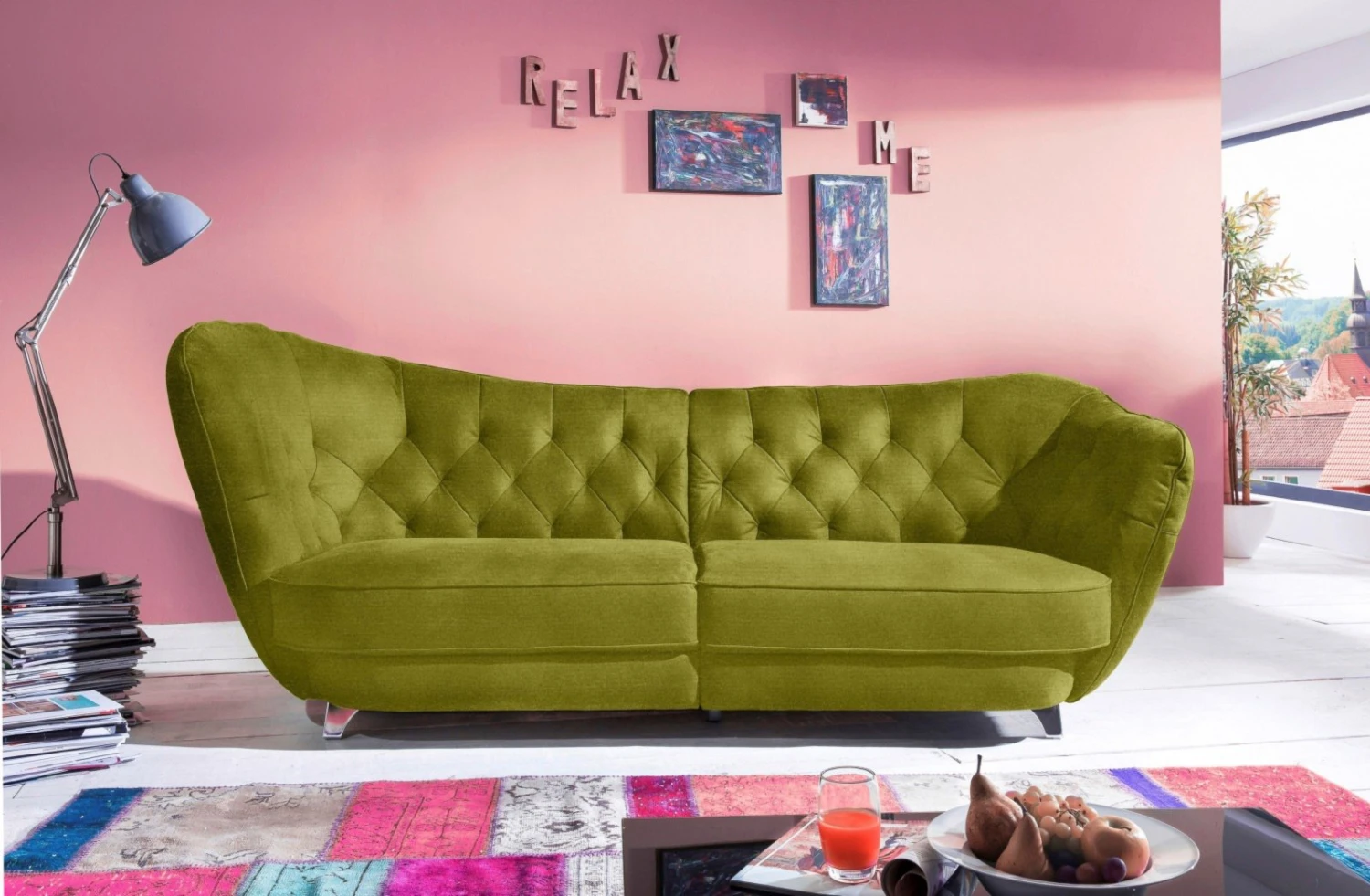 Machen Sie es sich auf diesem grünen Big-Sofa gemütlich und genießen Sie den tollen Komfort der Schaumkern-Polsterung, die von der Wellenunterfederung gestützt wird. Auf diesem 256 Zentimeter breiten Sofa können Sie nach einem stressigen Tag Ihre Seele baumeln lassen und einfach nur vor dem Fernseher entspannen. Mit einer Sitztiefe von etwa 79 cm können Sie sich schon fast hinlegen. Der Rücken ist mit dem Originalstoff bezogen, sodass Sie die Couch auch mitten in Ihrem Raum platzieren können.