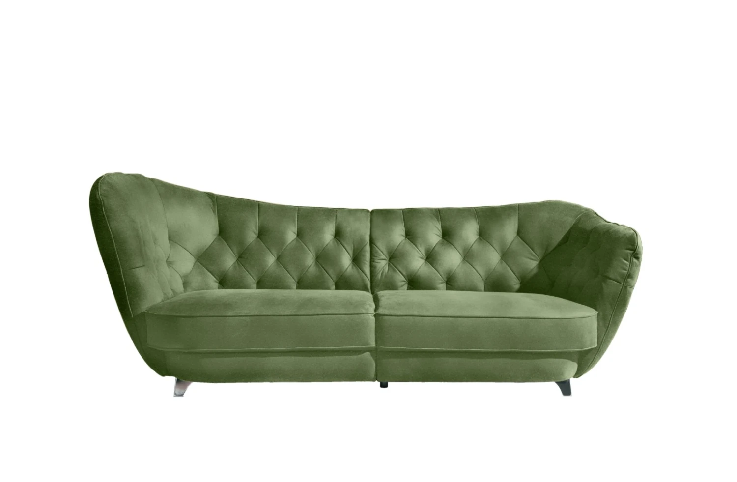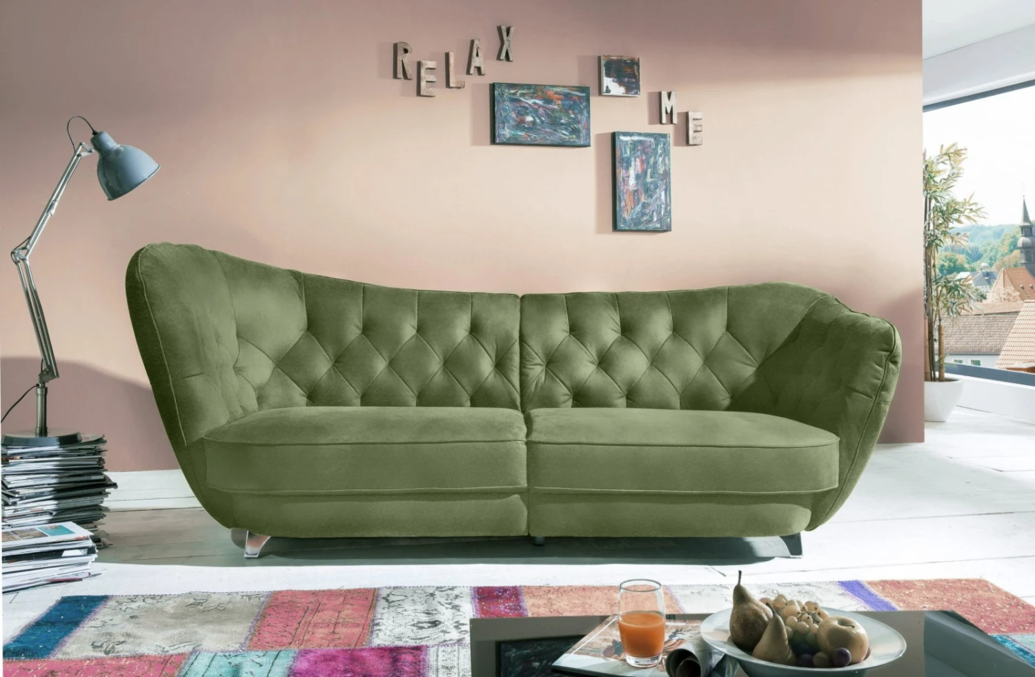 Machen Sie es sich auf diesem dunkelgrünen Big-Sofa gemütlich und genießen Sie den tollen Komfort der Schaumkern-Polsterung, die von der Wellenunterfederung gestützt wird. Auf diesem 256 Zentimeter breiten Sofa können Sie nach einem stressigen Tag Ihre Seele baumeln lassen und einfach nur vor dem Fernseher entspannen. Mit einer Sitztiefe von etwa 79 cm können Sie sich schon fast hinlegen. Der Rücken ist mit dem Originalstoff bezogen, sodass Sie die Couch auch mitten in Ihrem Raum platzieren können.