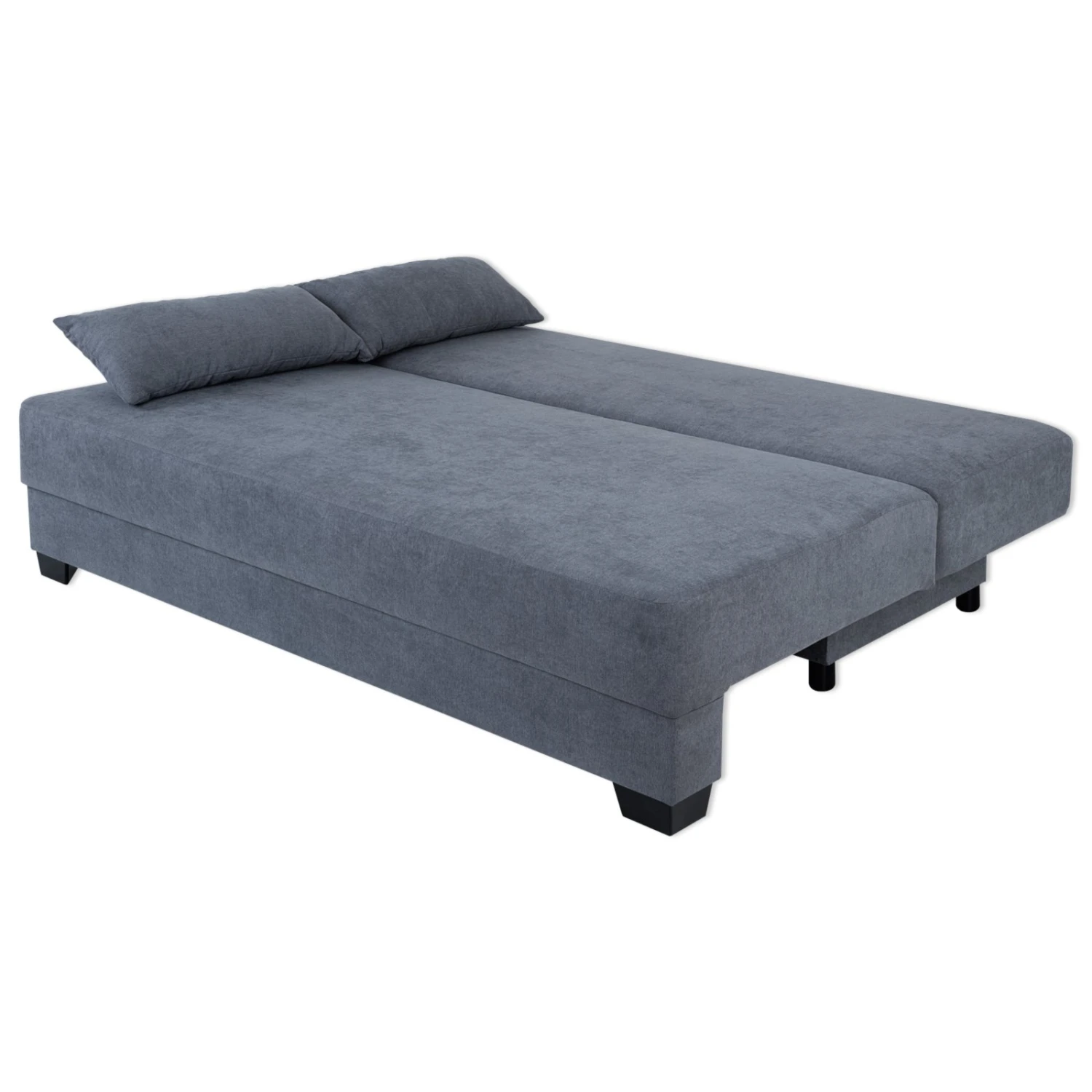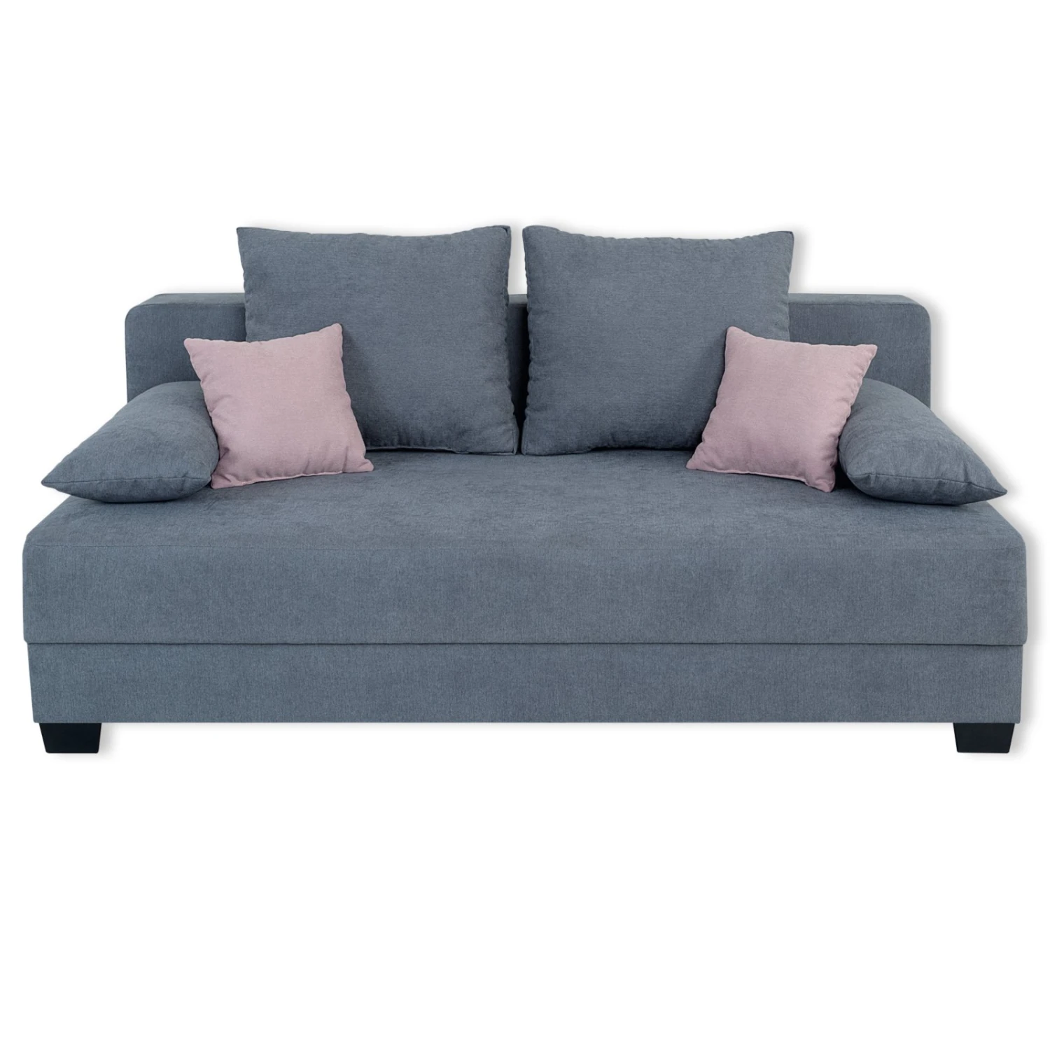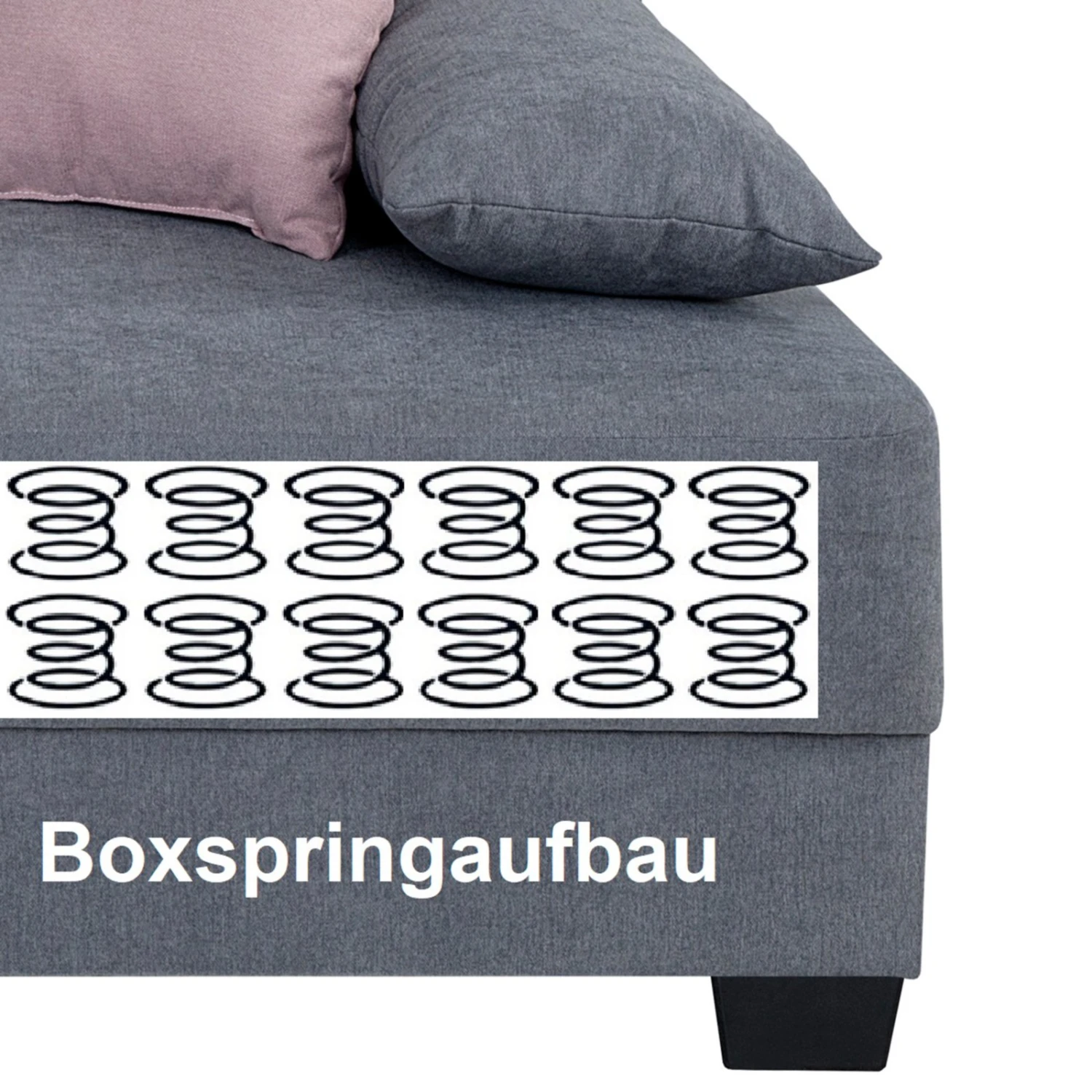Praktisches und beqeuemes Sofa mit Dauerschläferfunktion und hochwertiger Boxspring-Polsterung. Dieses graue Sofa ist die ideale Lösung für Gäste, die bei Ihnen übernachten wollen, denn es ist mit einer Liegefunktion ausgestattet. Somit bietet sich eine Liegefläche von ca. 200 x 160 cm an, Gäste über Nacht einzuladen. Der Rücken ist mit dem Originalstoff bezogen, sodass Sie auch die Möglichkeit haben, dieses Sofa mittig des Raumes zu stellen. Jeweils zwei graue Rücken- und Armlehnkissen sorgen nicht nur für noch mehr Komfort, sondern machen optisch noch etwas her. Die zwei Zierkissen in Flamingorosa sorgen zusätzlich für einen dekorativen Farbakzent. Der geräumige Staukasten eignet sich bestens, um dort Bettdecken und Kissen zu verstauen.