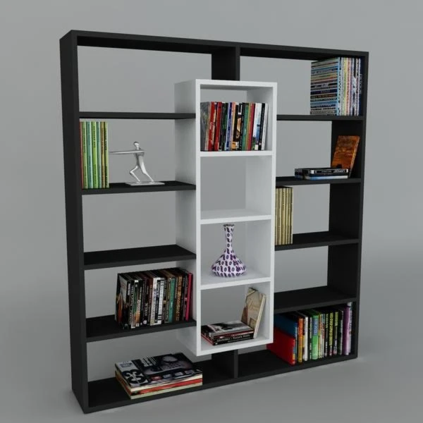 Mit diesem modernen Bücherregal finden Ihre Bücher und Wohnaccessoires reichlich Platz. Gut platziert, können Sie es, aber auch als Raumteiler verwenden. Der klassische Farbauftritt in Schwarz-Weiß lässt sich hervorragend mit vorhandenen Wohnstilen kombinieren.