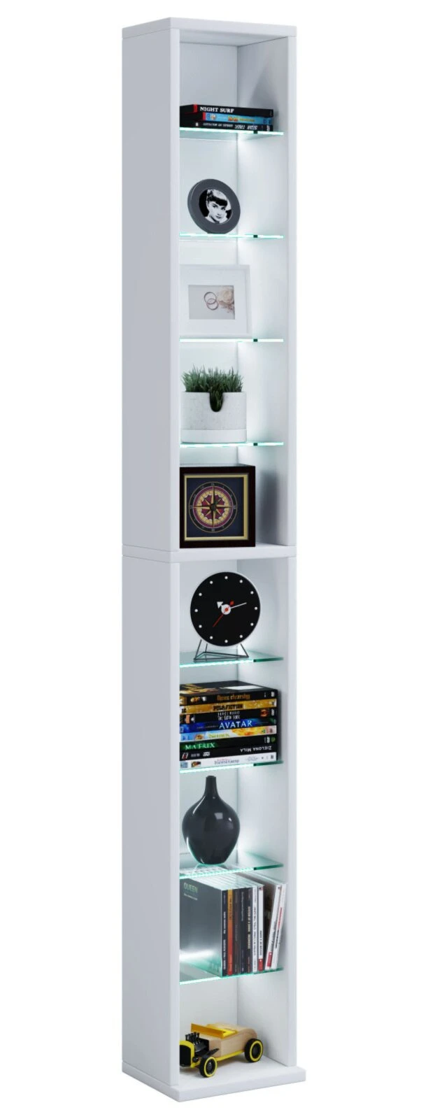 Das moderne CD-DVD-Regal RASATO XL in der Farbe Weiß. Dieses Regal wird der Hingucker schlechthin in Ihrem Wohnambiente sein. Es besitzt insgesamt zehn offene Fächer, in denen Sie Ihre liebsten CDs und DVDs großartig in Szene setzen können. Ein besonderes Highlight sind die acht variablen Fachböden aus ESG-Sicherheitsglas, welches nicht nur höchste Stabilität und Belastbarkeit verspricht, sondern zudem noch grandios aussieht.
