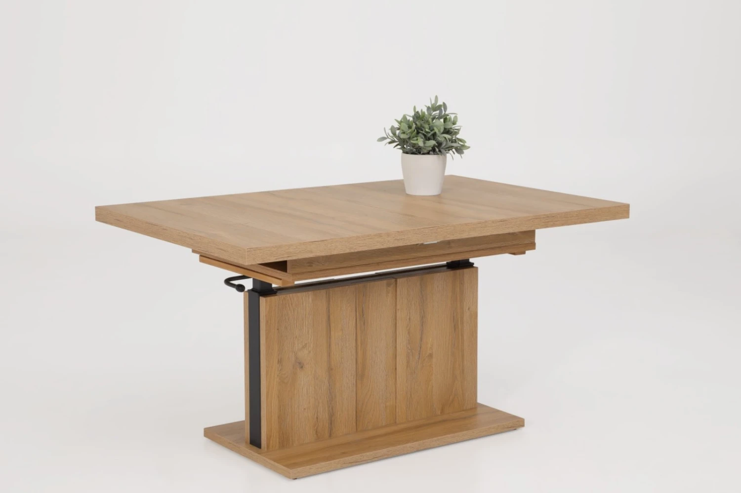 Der Couchtisch in Alteiche Nachbildung lässt sich in seiner Höhe und Breite verstellen. Mittels der Gasdruckfeder können Sie ihn auf Esstischhöhe ausrichten und der Synchronauszug ermöglicht bei dem Couchtisch eine Breite von etwa 150 Zentimetern. Für das gewisse Etwas sorgt der anthrazitfarbene Streifen an den Seiten, der sich dezent vom Holzdekor absetzt.