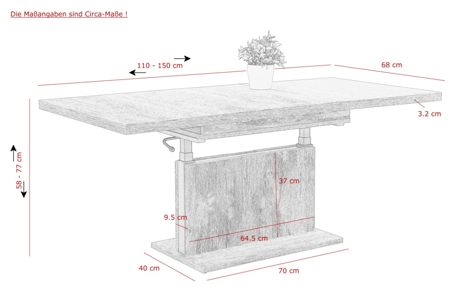 - Maße: BxHxT ca. 110-150 x 58-77 x 68 cm