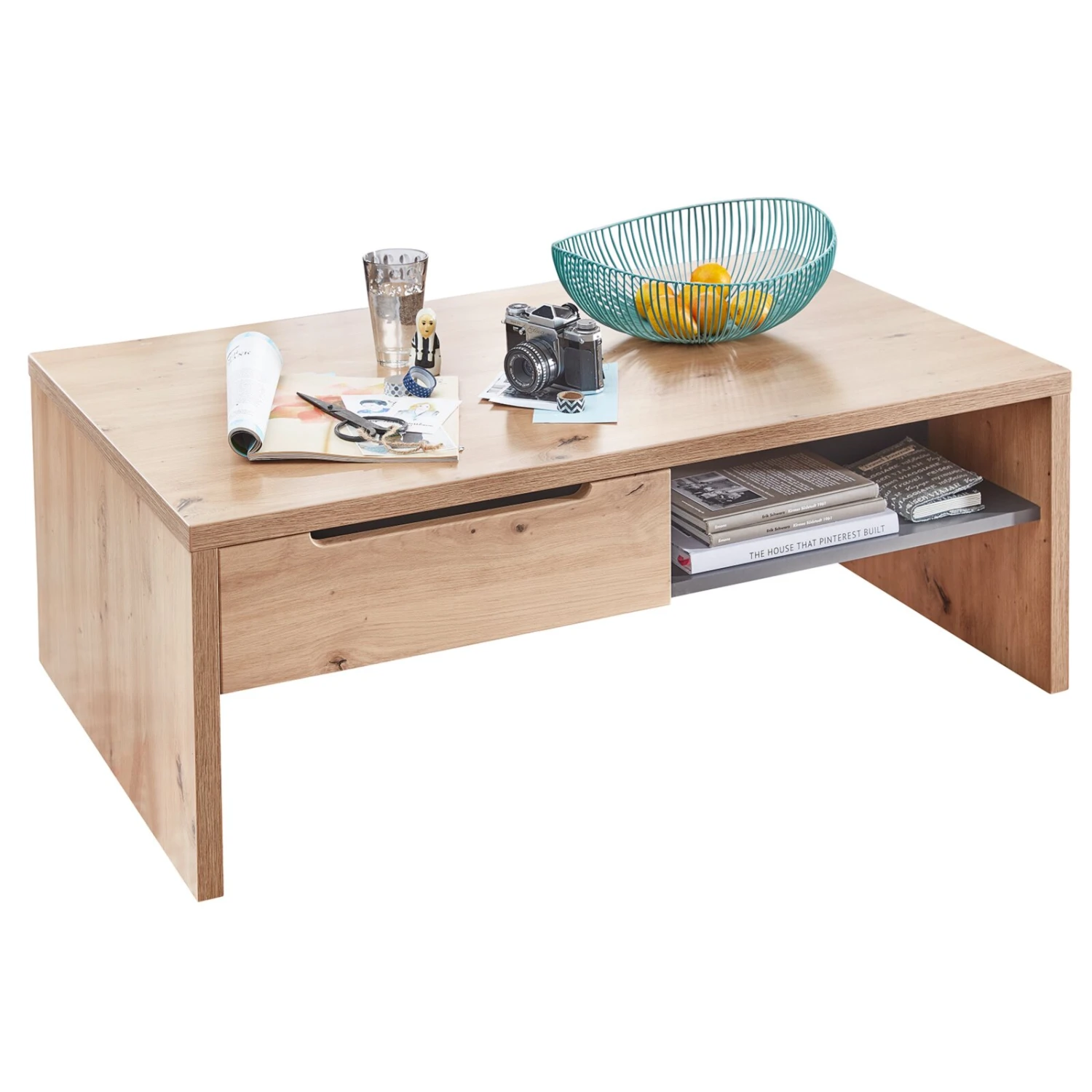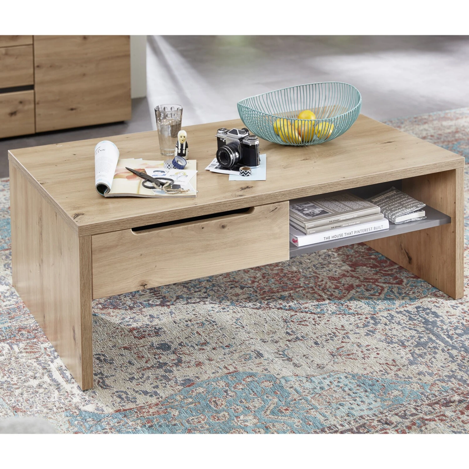 Der etwa 110 Zentimeter breite Couchtisch bietet nicht nur eine große Ablagefläche, zudem ist er mit zwei geräumigen Schubkästen und zwei offenen Fächern ausgestattet. Somit kann der Tisch mit reichlich Platz für Zeitschriften und Fernbedienungen punkten.
