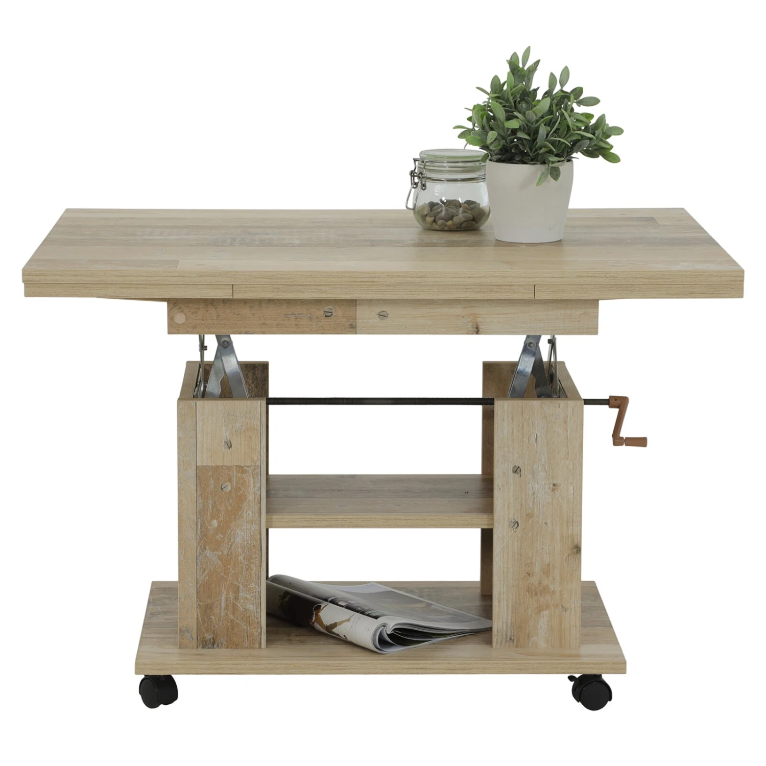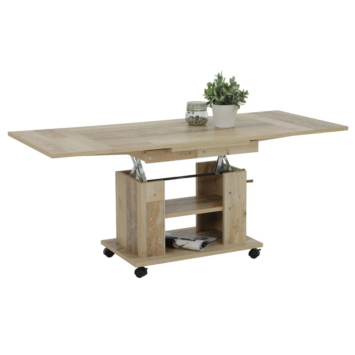 Dieser Couchtisch aus einer Artisan Eiche Nachbildung ist ein echtes Multitalent! Er lässt sich in der Breite ausziehen, ist mittels einer Kurbel höhenverstellbar und verfügt über Ablagen zum Lagern einer Fernsehzeitung, Fernbedienungen oder anderen Utensilien. Zudem besitzt der Tisch praktische Rollen, wodurch er sich besonders leicht beim Putzen zur Seite schieben lässt.