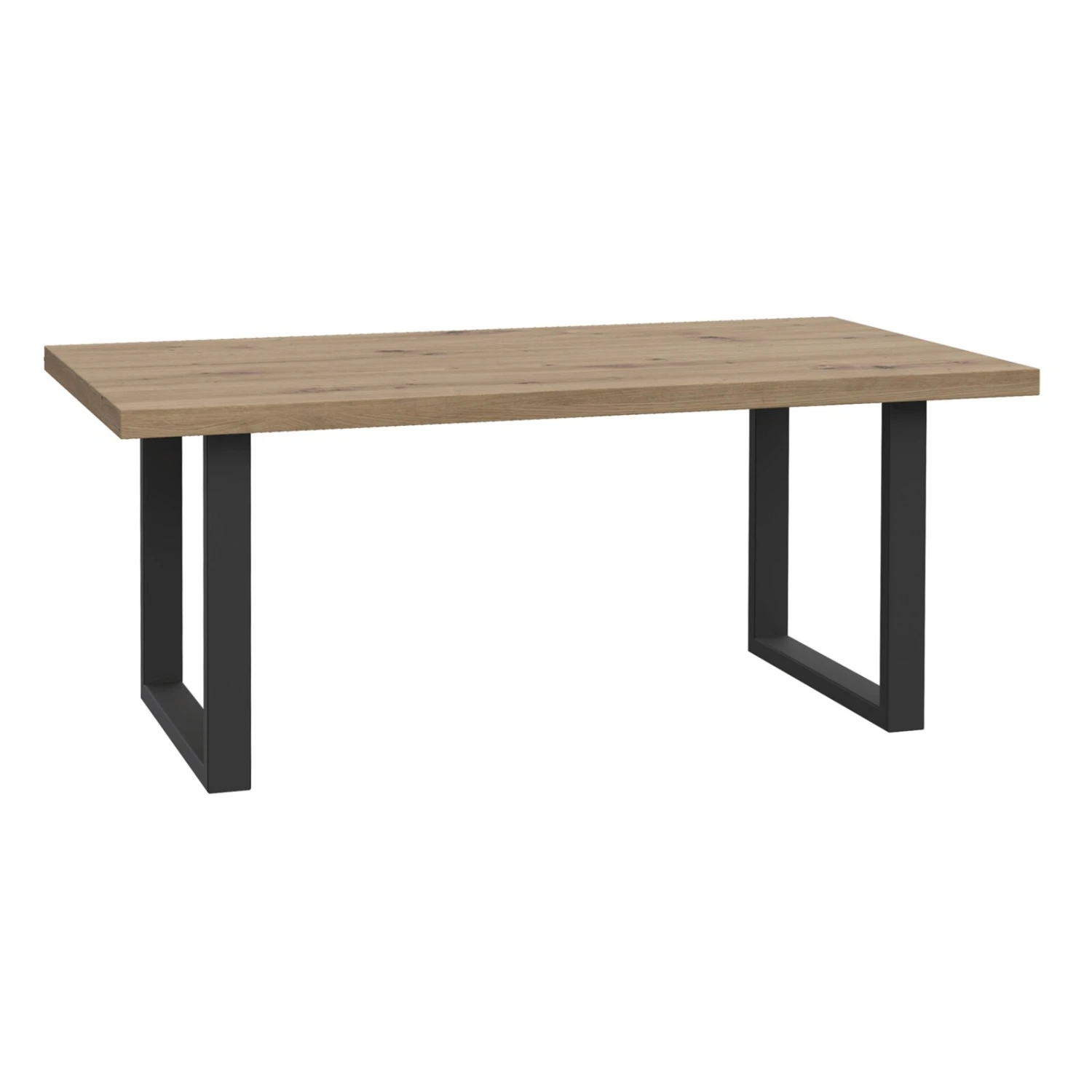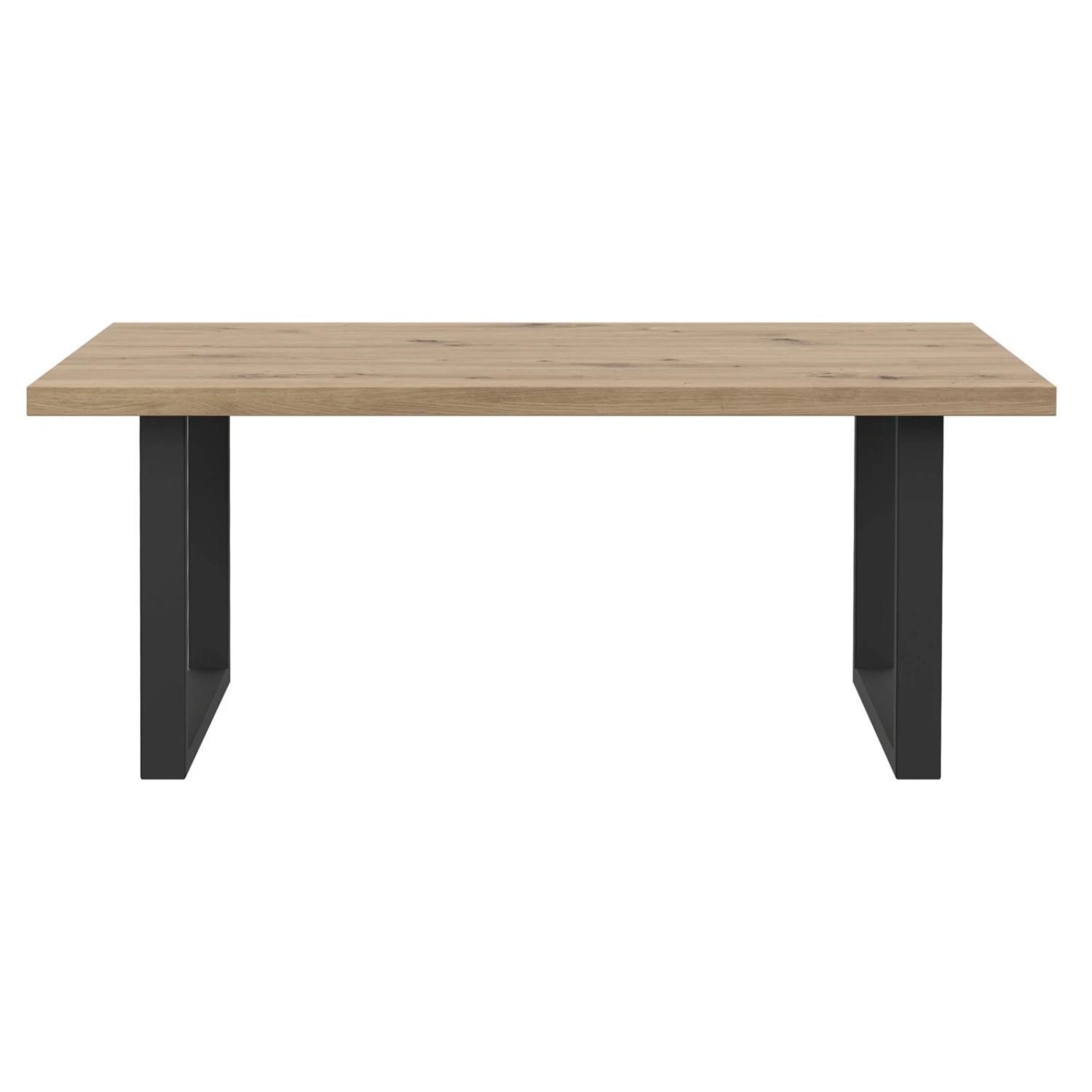 Dieser moderne Couchtisch sorgt in deinem Wohnzimmer für einen tollen Blickfang! Die Tischplatte ist in Artisan Eiche Nachbildung gehalten. Die U-Gestell Beine aus schwarzem Metall bieten einen schönen Kontrast zu der Tischplatte.