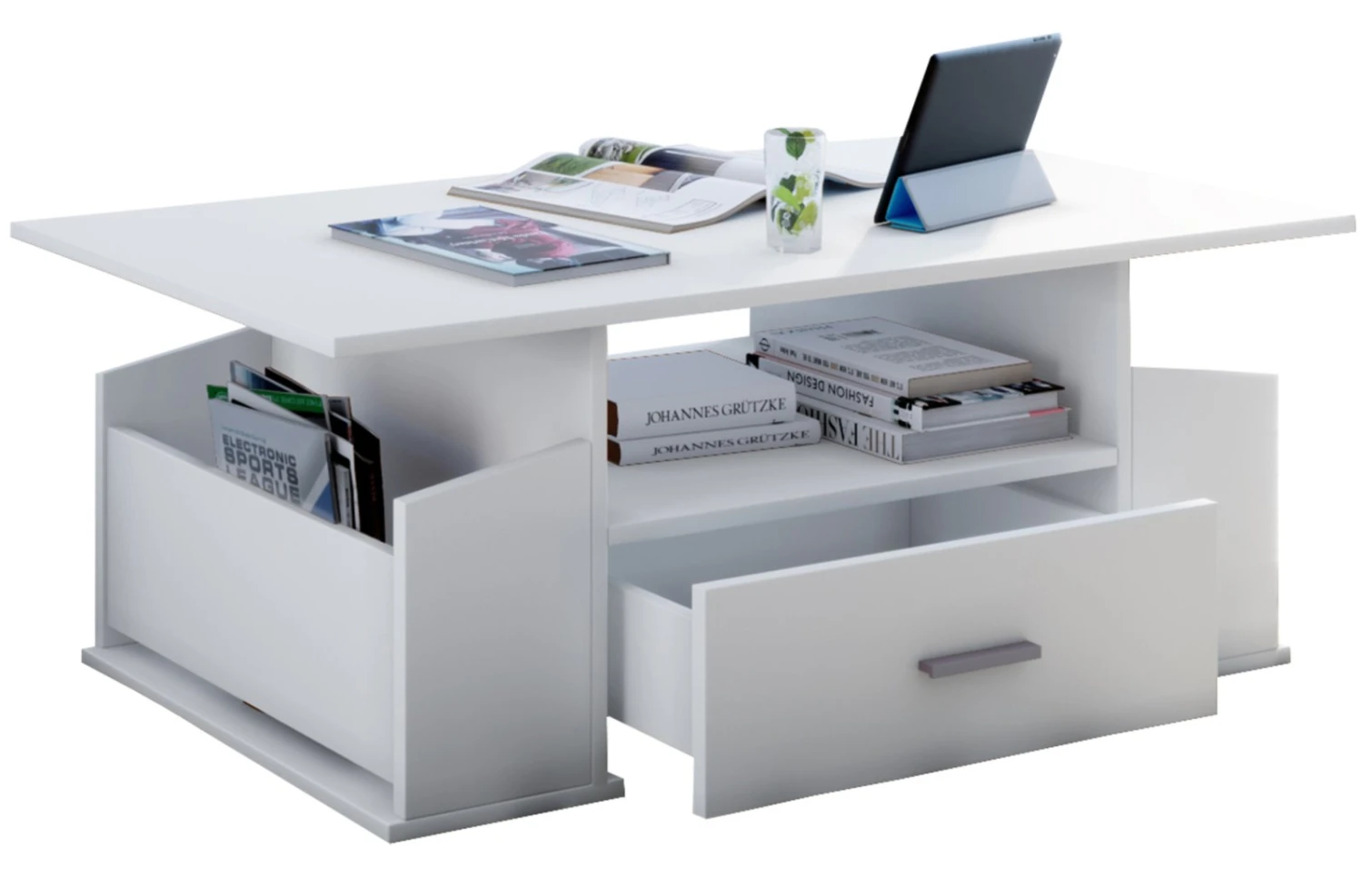 Dieser Couchtisch ist ein echtes Stauraumwunder! Er besetizt nicht wie üblich über nur eine Ablage, zudem ist er mit einem leichtgängigen Schubkasten und zwei großen Außenfächer ausgestattet. Somit finden einige Ihrer Gebrauchsgegenstände Platz und sind beim Fernsehen immer griffbereit.