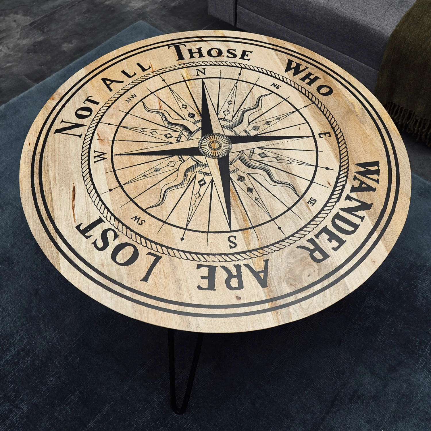 Die Kombination aus massivem Mangoholz und dem schwarzen Gestell verleihen diesem Tisch einen besonderen Akzent. Gepaart mit dem Kompass-Motiv auf der Tischplatte und dem Schriftzug, dass nicht alle, die wandern, verloren sind, erinnert der Tisch an die Seefahrer dieser Welt. Den rustikalen Stil verköpert auch das Material, hierbei handelt es sich um massivem Mangoholz.